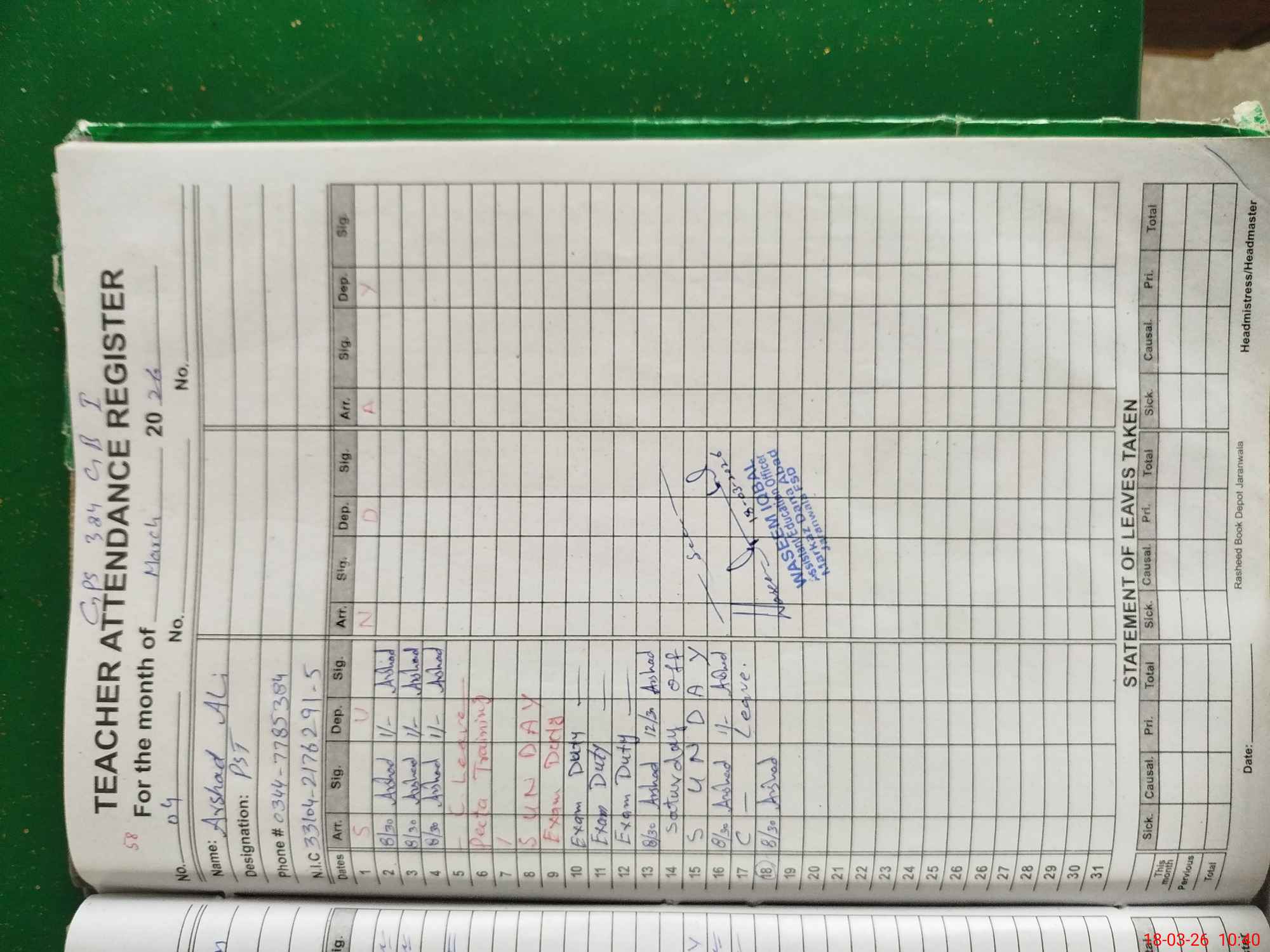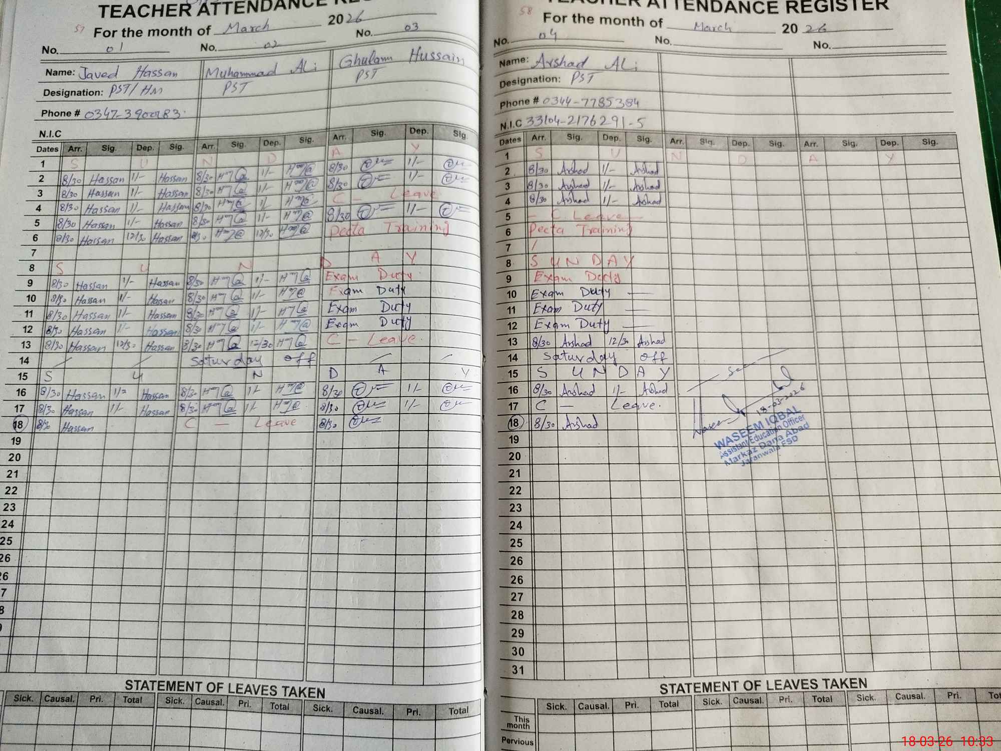 | Name: JA**** HA**** Designation: (School Headmaster's/Headmistress's) ESE (HM ) Phone/Cell Number: 03**** |