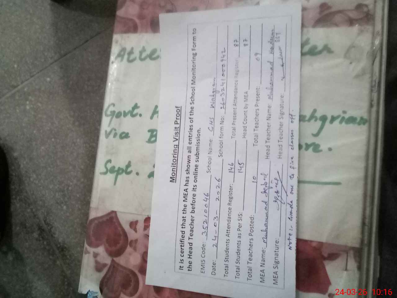 | Attendance Register | Head Teacher | MEA with School | Visit Proof |