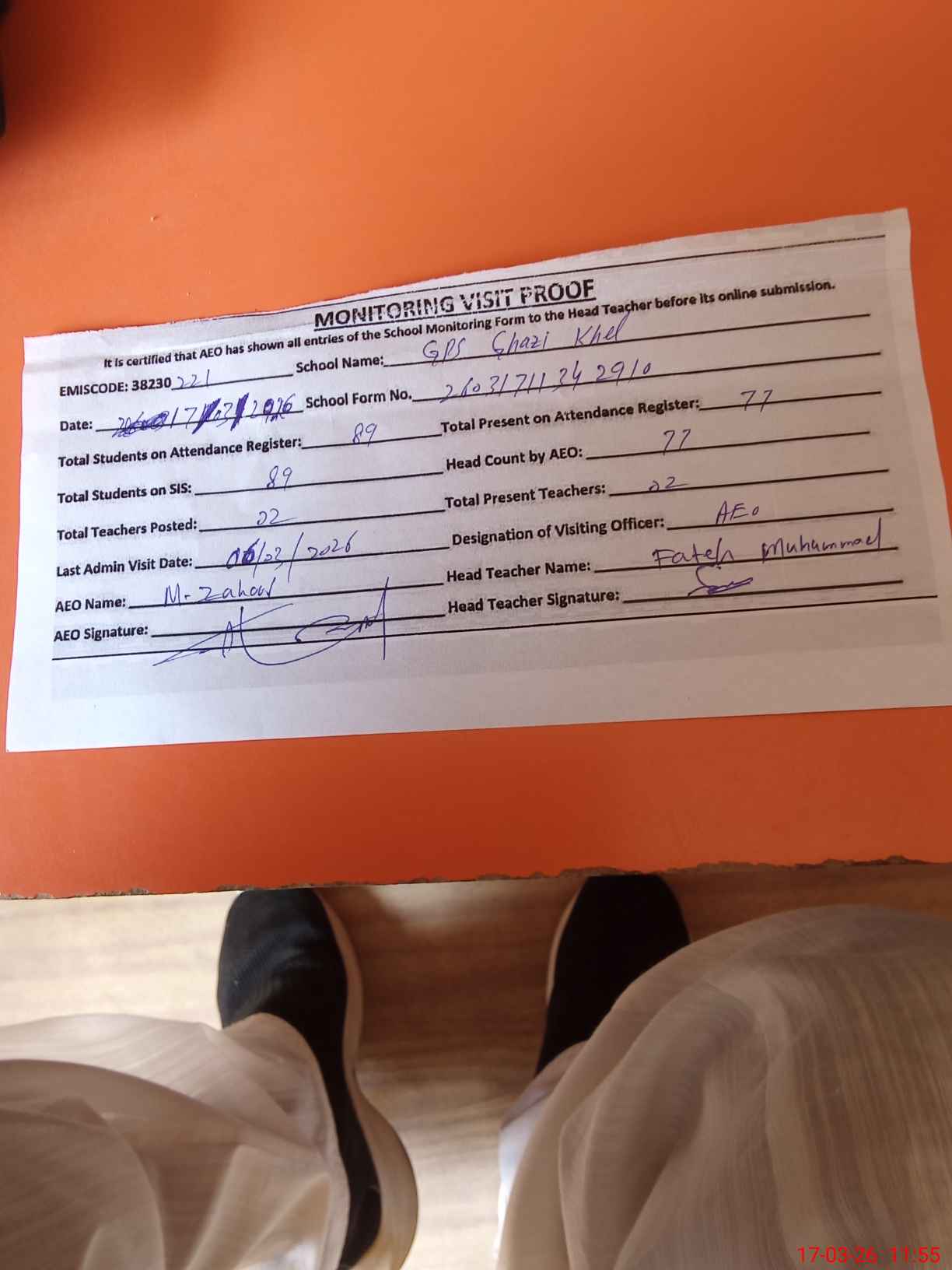 | Attendance Register | Head Teacher | MEA with School | Visit Proof |