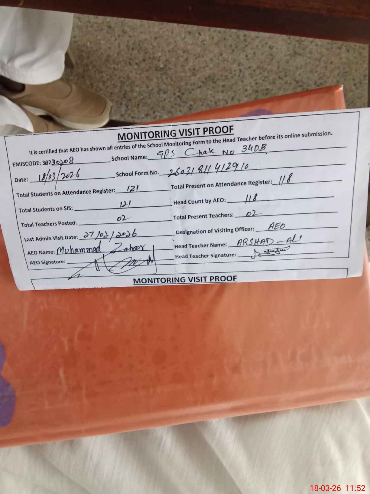 | EMIS Code: 38230208 | Name of School: GPS CHAK NO. 34/DB | |||