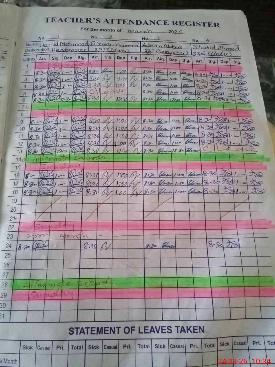 | Leave | Duty | Absent | Maternity | Medical | Ex- Pak |