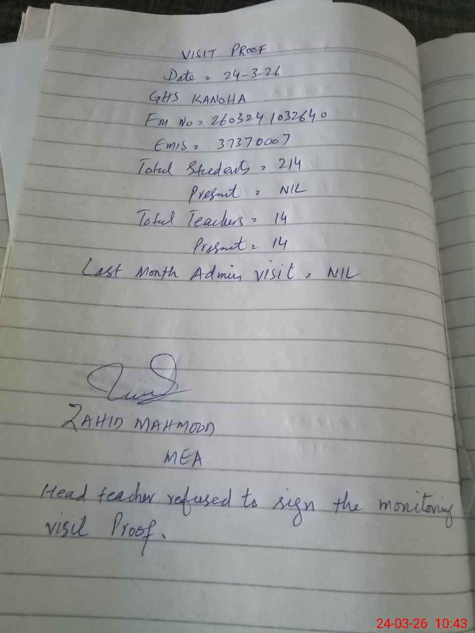 | Remarks (Use Separate Page if Required): Head teacher Mr Hamid refused to sign the monitoring visit proof. | |||||