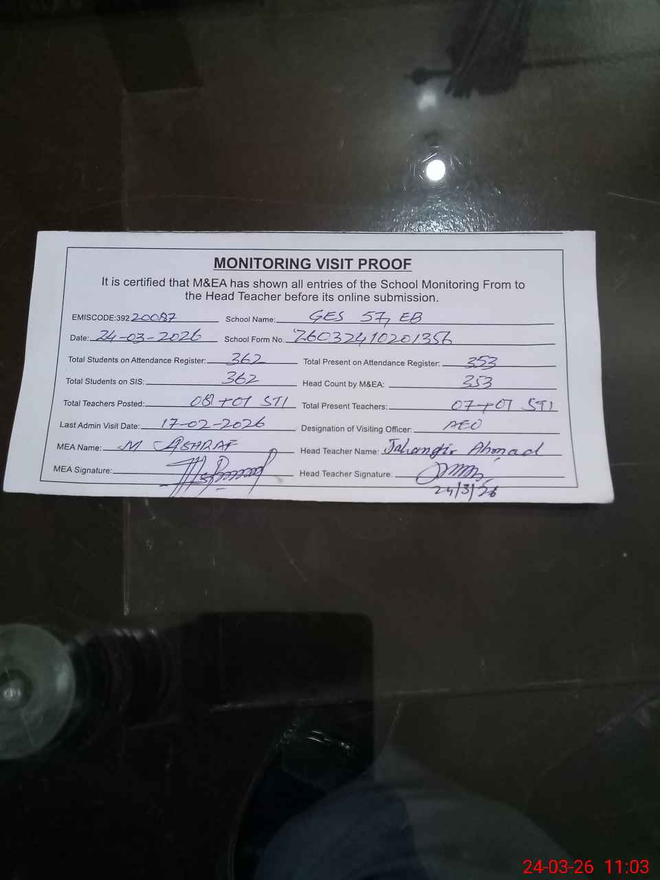 | Attendance Register | Head Teacher | MEA with School | Visit Proof |