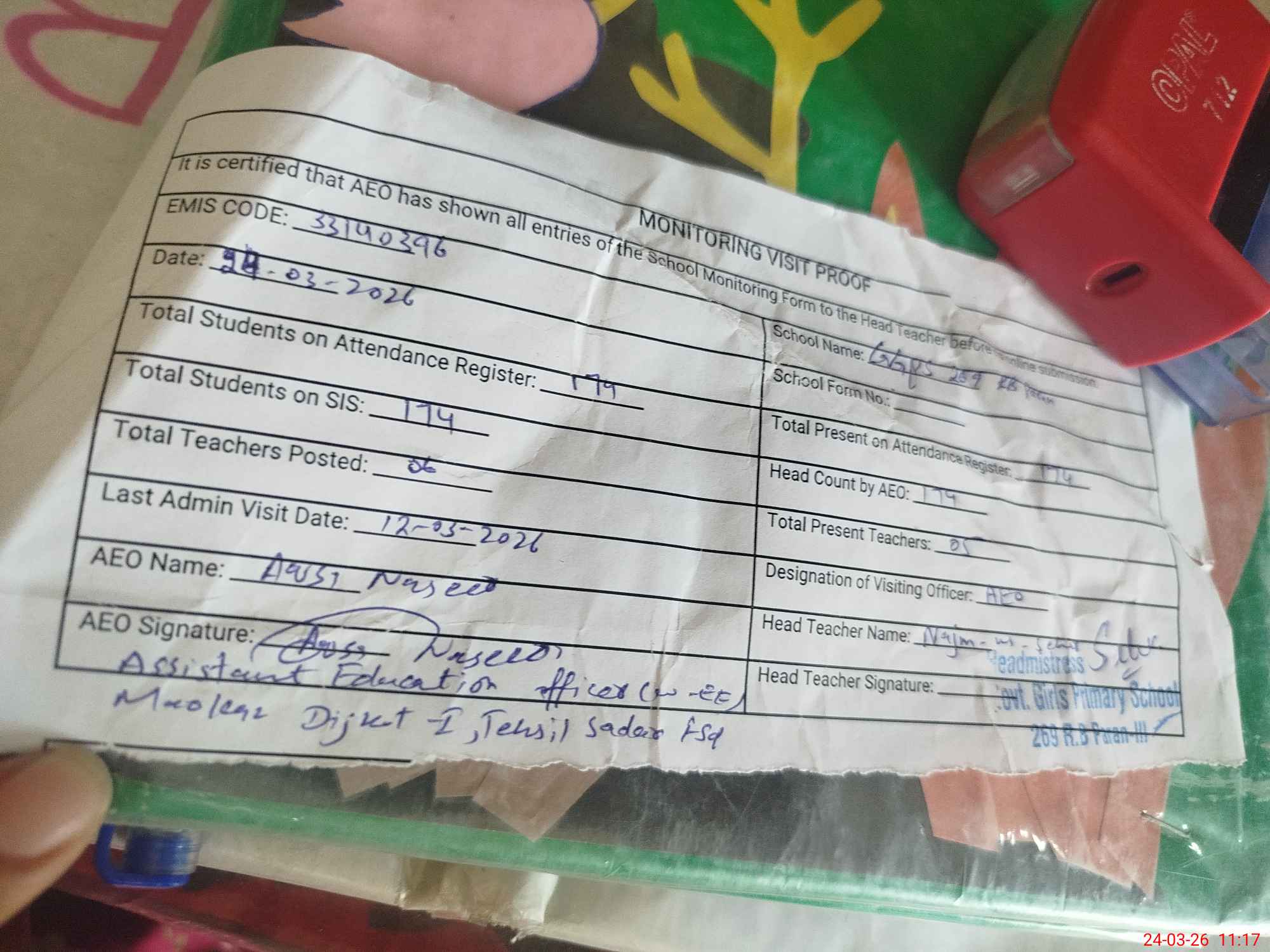 | Attendance Register | Head Teacher | MEA with School | Visit Proof |