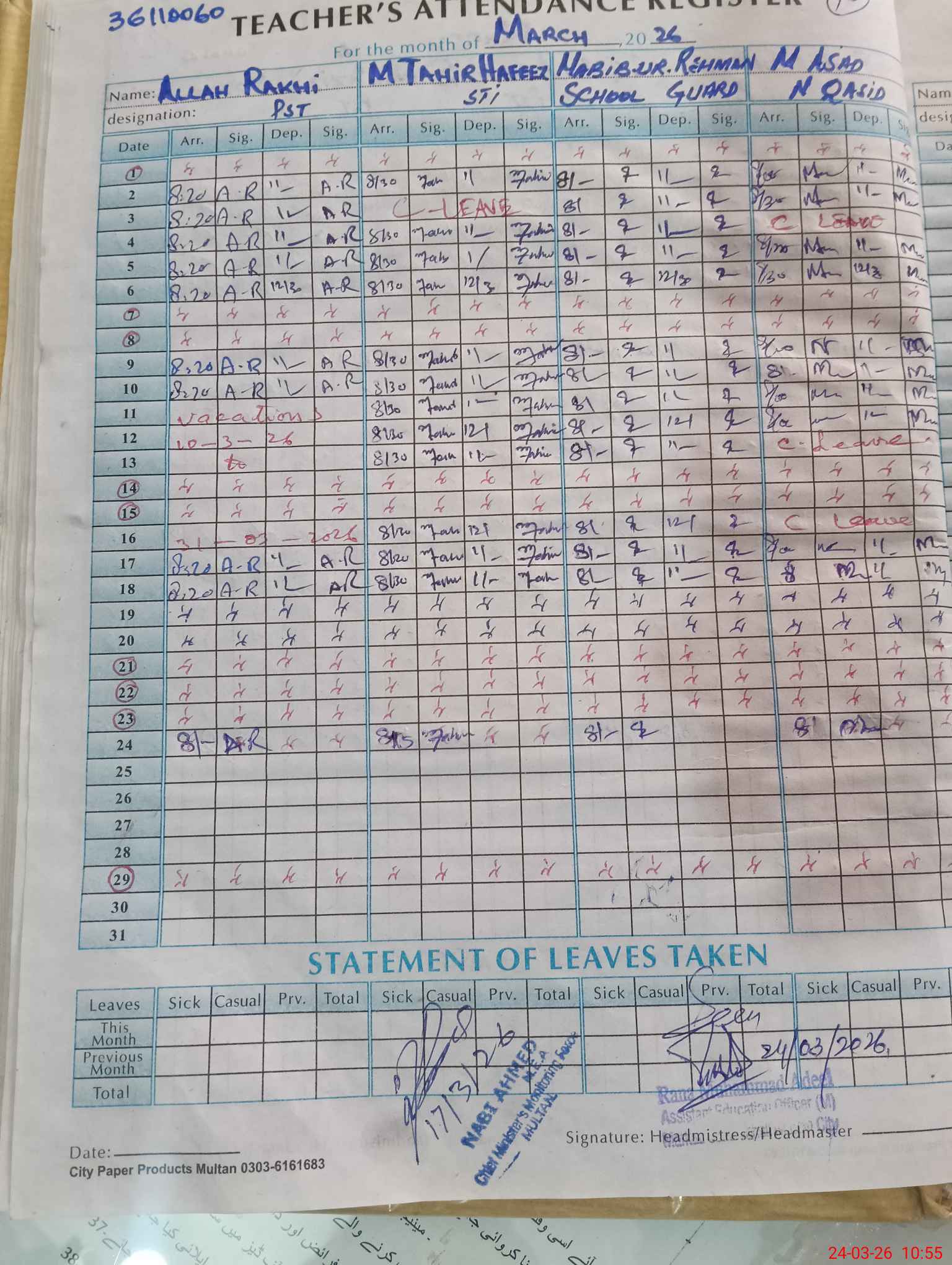 | CNIC | Full Name | Designation | R/C | Absence During Last Calender Month |