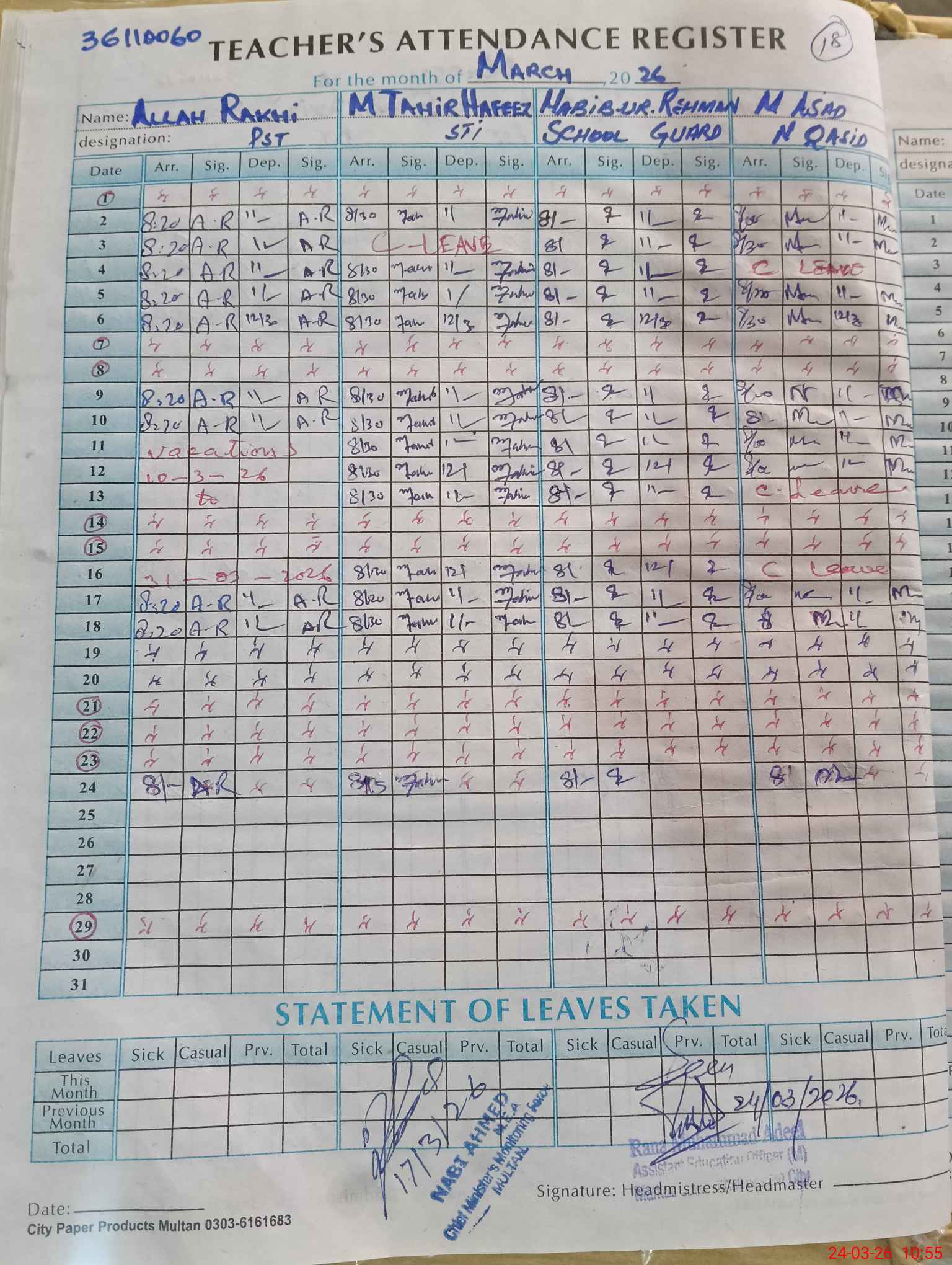 | Leave | Duty | Absent | Maternity | Medical | Ex- Pak |