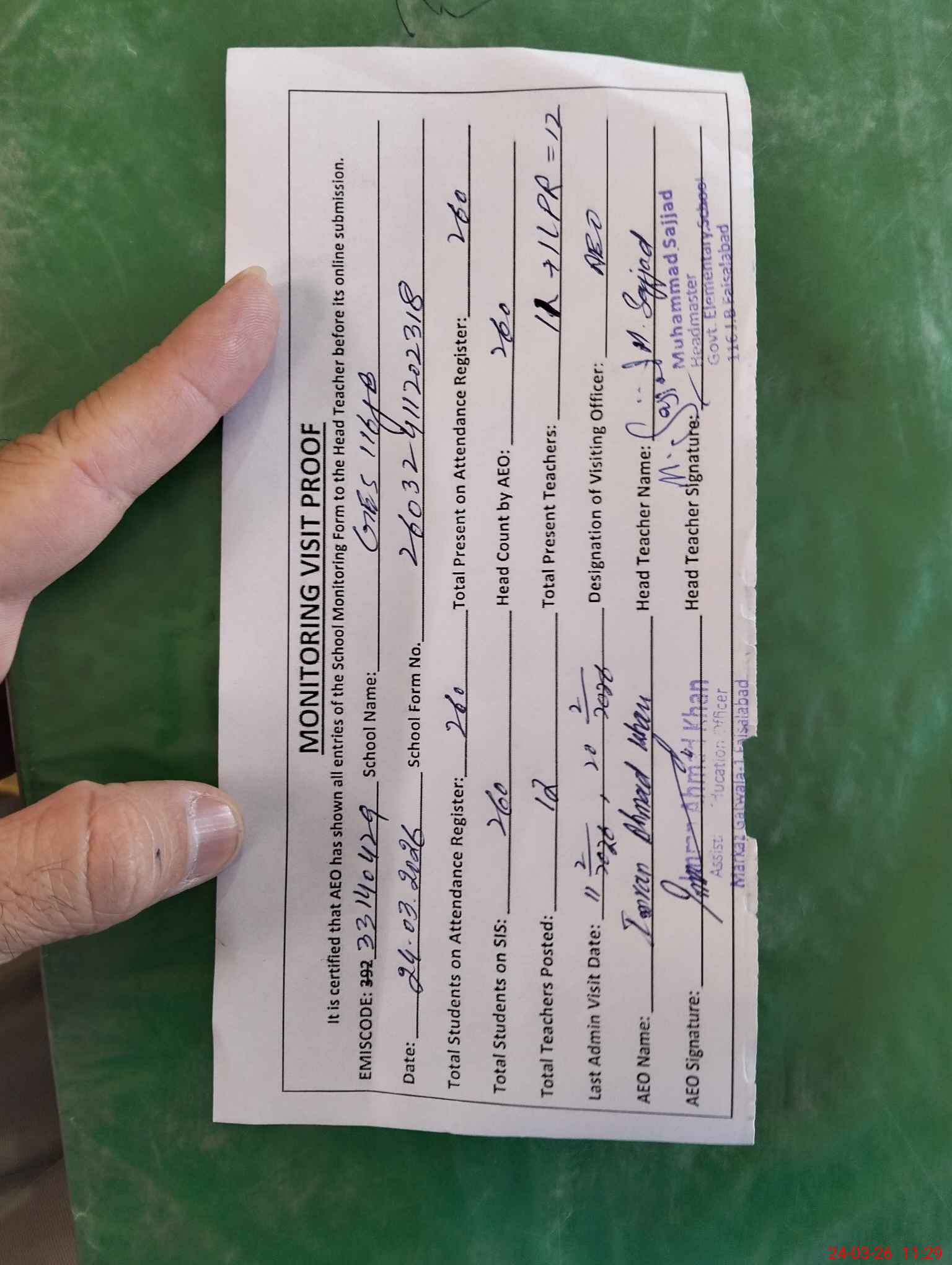 | Attendance Register | Head Teacher | MEA with School | Visit Proof |