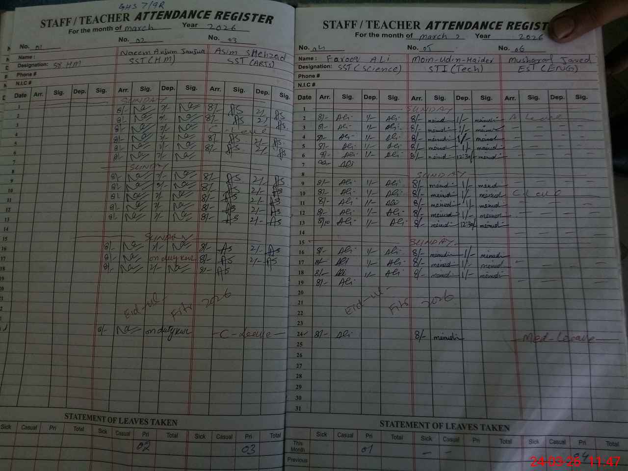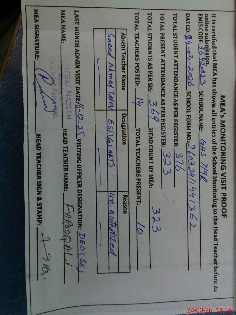 | Remarks (Use Separate Page if Required): 1. ECE, Nursery, 1, 2, 3,4, 5 classes exam completed attendence taken from roznamcha 2. 9th and 10th classes free for board exam 3. Out of 10 toilets 04 toilets are functional 06 nonfunctional saverag line blocked 4. 9th class on line attendence received and class free for board exam all are absent from school 5. NSB and FTF record not maintained | |||||
