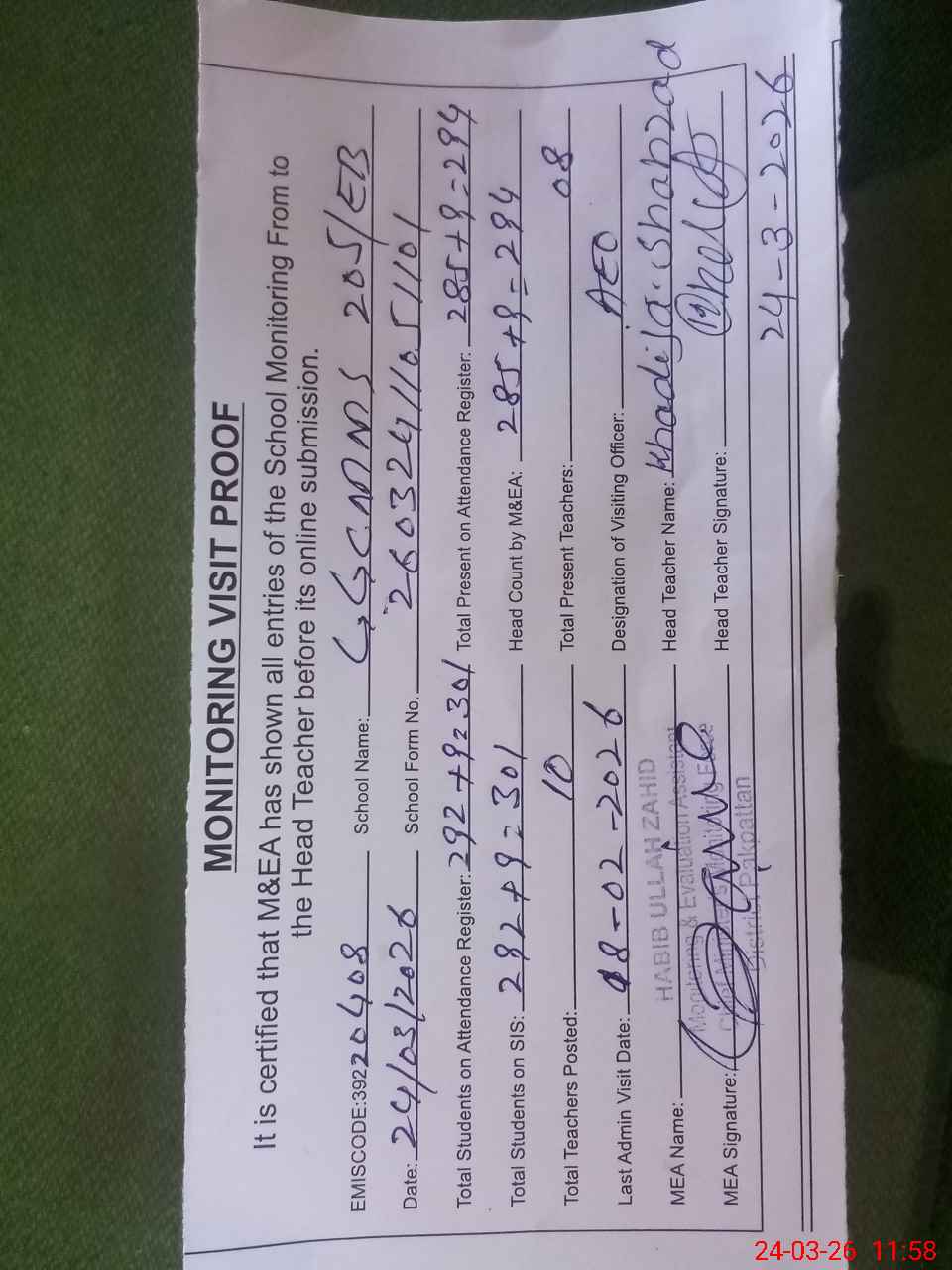 | Certified that this School was Inspected by the Undersigned MEA/DMO Today and the Information Stated Above is as Per Record. | |||||