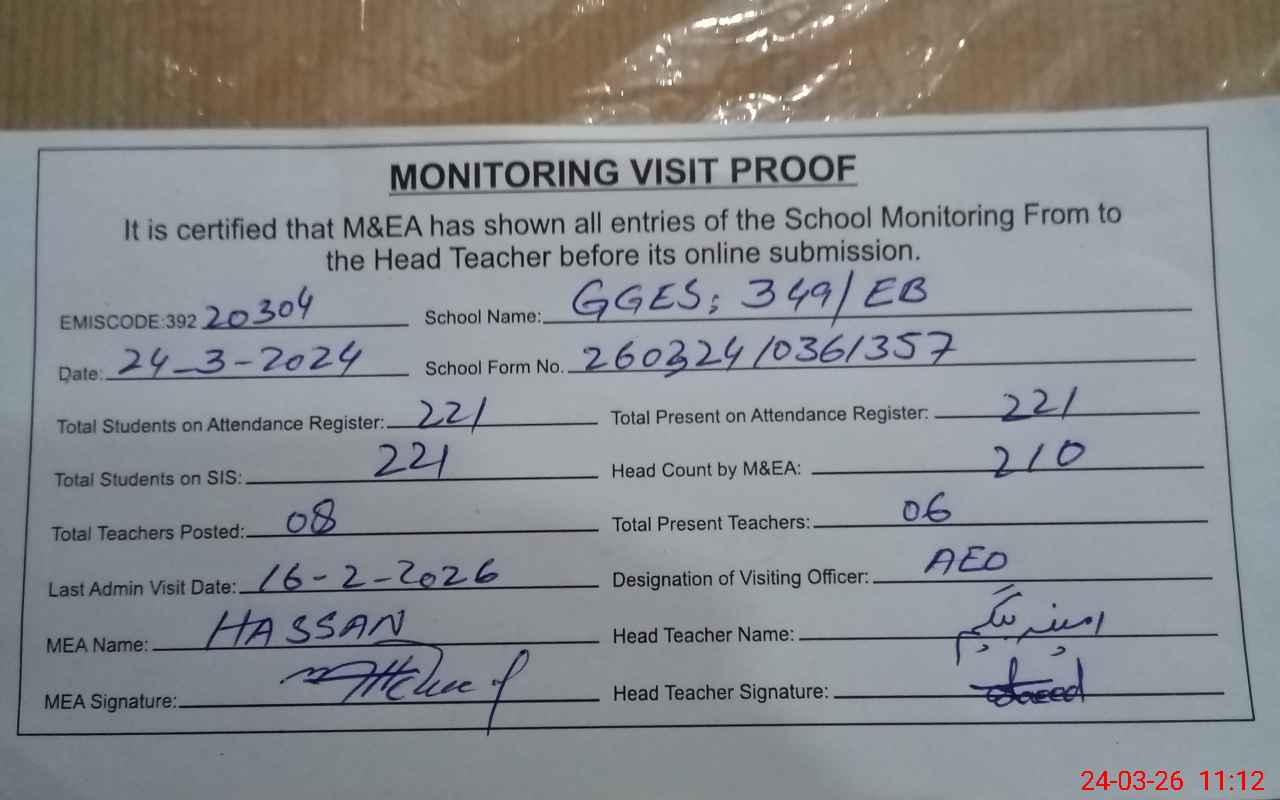 | EMIS Code: 39220304 | Name of School: GGES 349 EB POST OFFICE chak 157/EB | |||