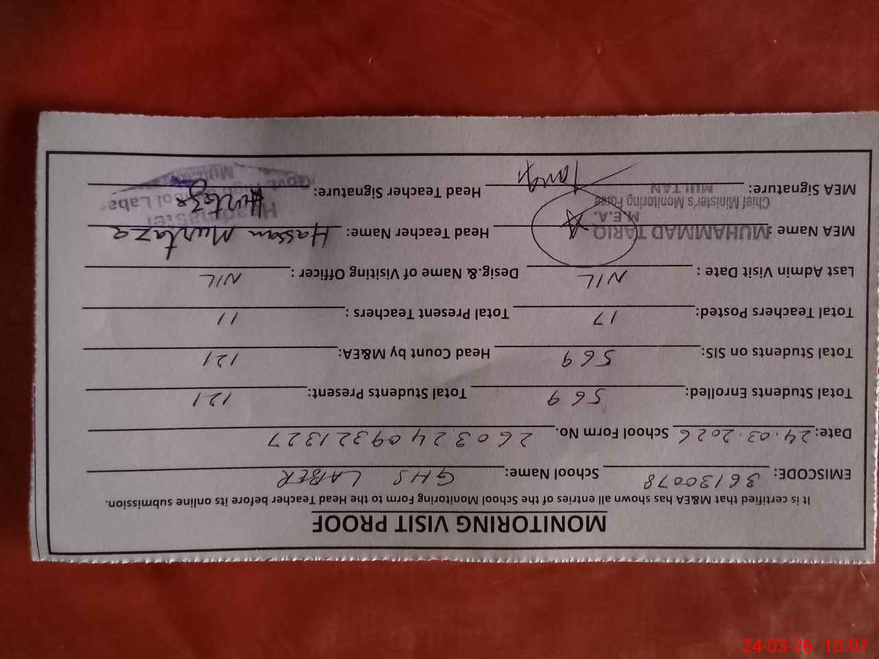 | Certified that this School was Inspected by the Undersigned MEA/DMO Today and the Information Stated Above is as Per Record. | |||||