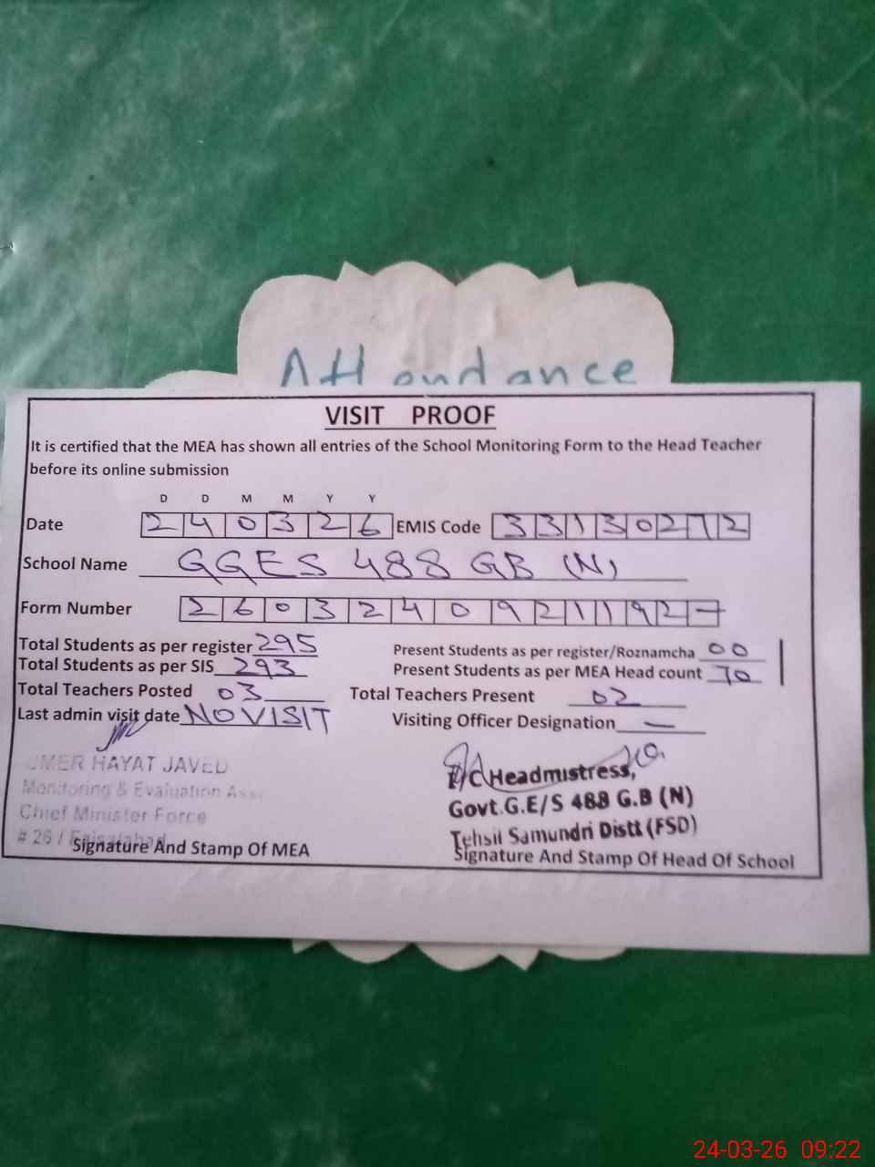 | Attendance Register | Head Teacher | MEA with School | Visit Proof |