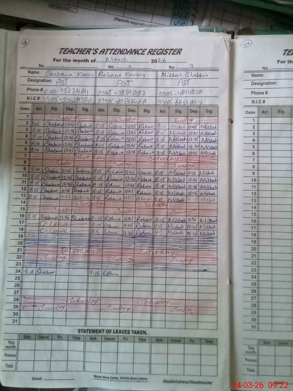 | CNIC | Full Name | Designation | R/C | Absence During Last Calender Month |