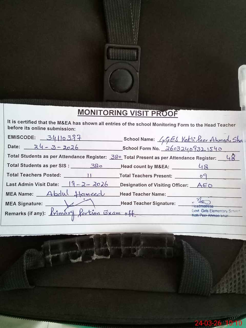 | Monitoring Date: 24-03-2026 | Start Time: 24-03-2026 09:32 AM | End Time: 24-03-2026 10:11 AM | Name of MEA: N-**** Ha**** | |