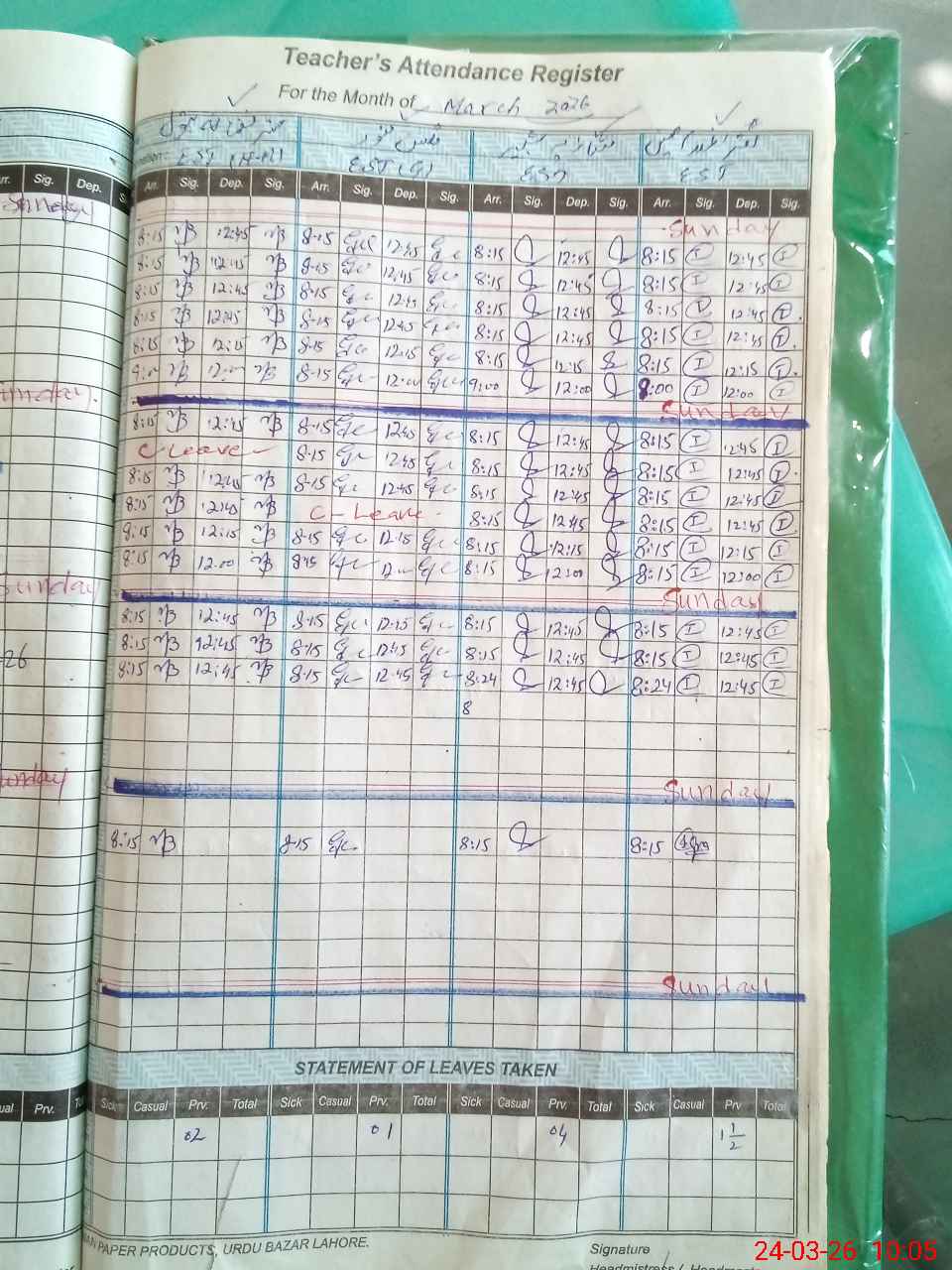 | Leave | Duty | Absent | Maternity | Medical | Ex- Pak |