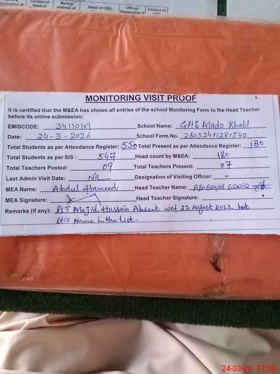 | Attendance Register | Head Teacher | MEA with School | Visit Proof |