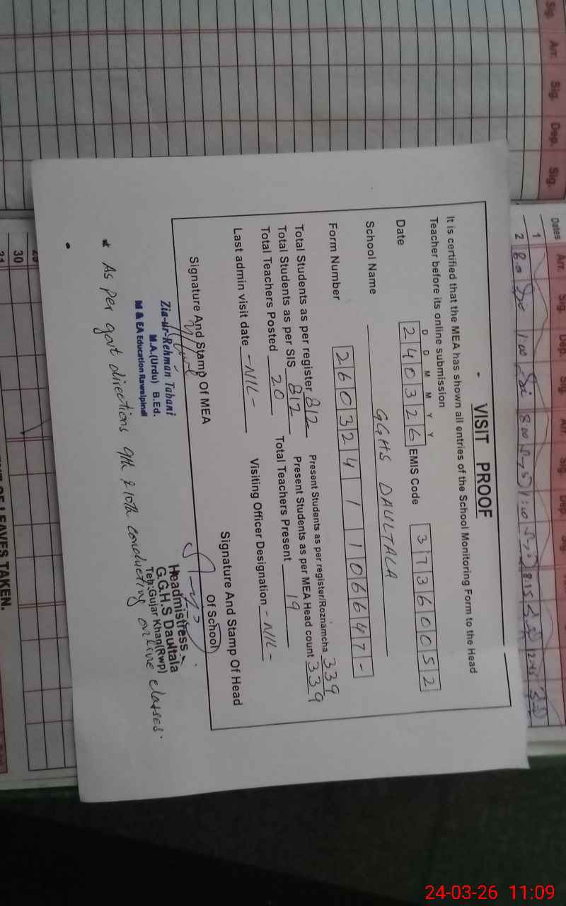 | Certified that this School was Inspected by the Undersigned MEA/DMO Today and the Information Stated Above is as Per Record. | |||||