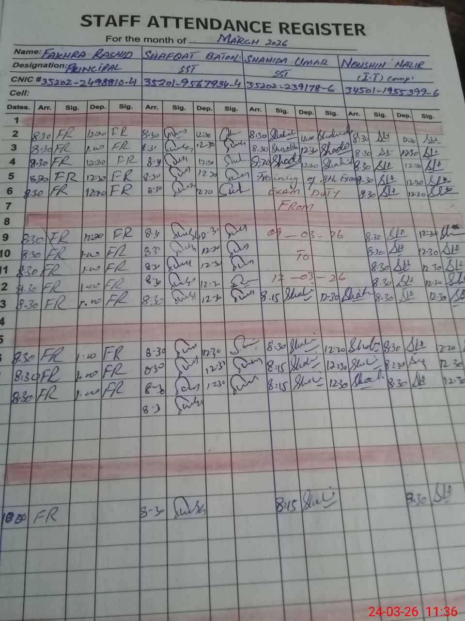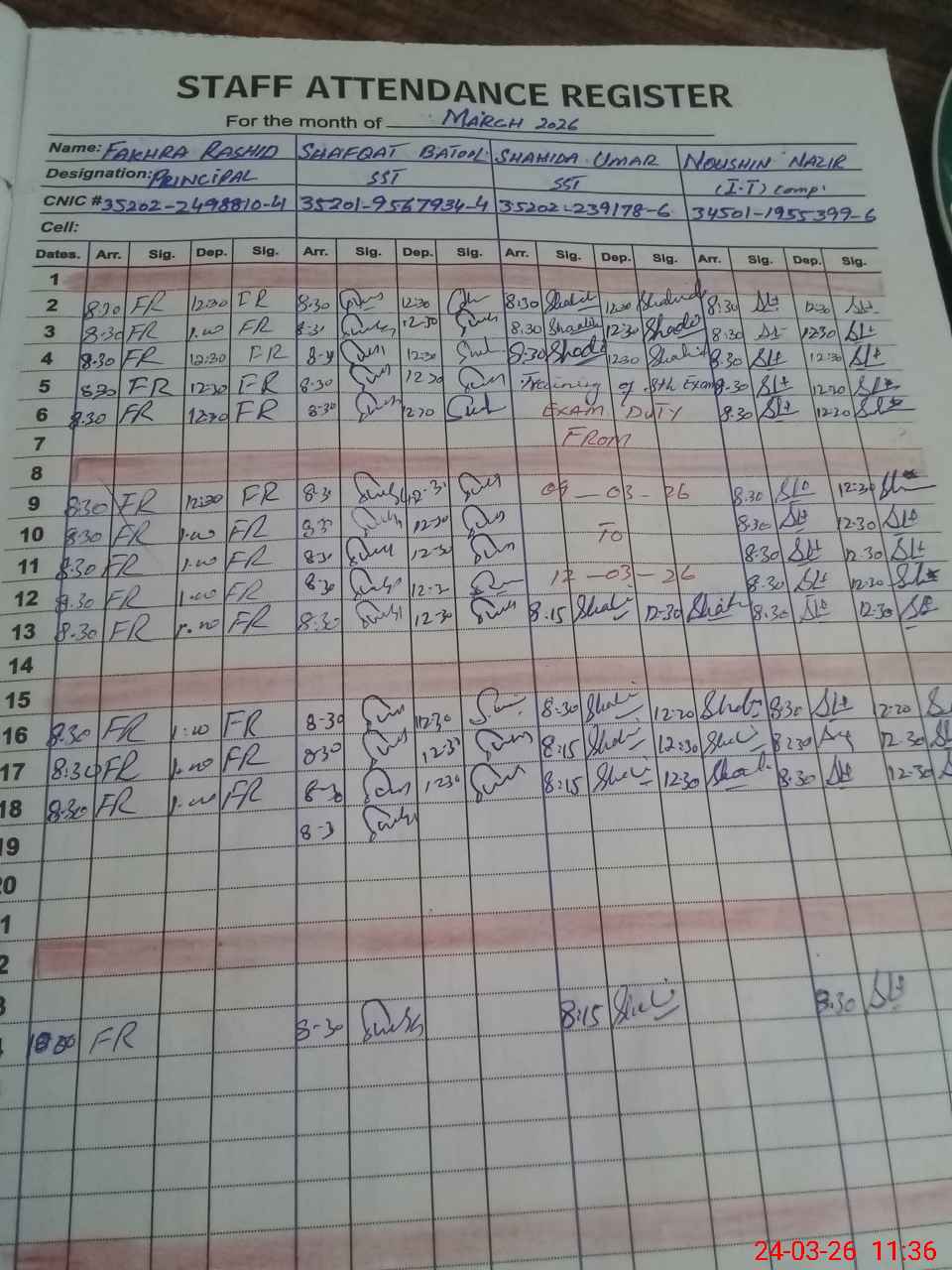 | CNIC | Full Name | Designation | R/C | Absence during last cal. month |