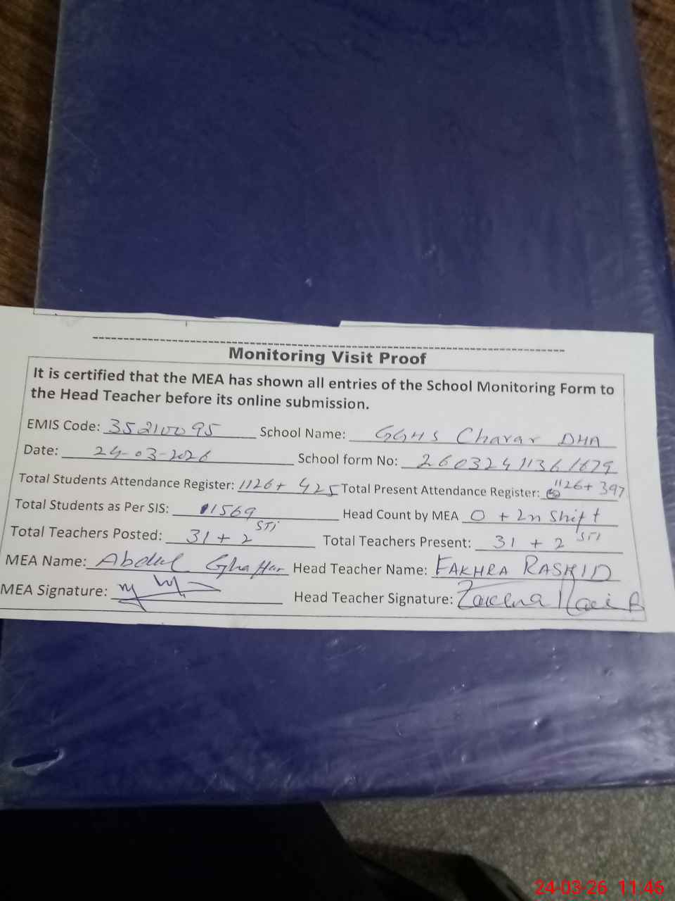 | Attendance Register | Head Teacher | MEA with School | Visit Proof |