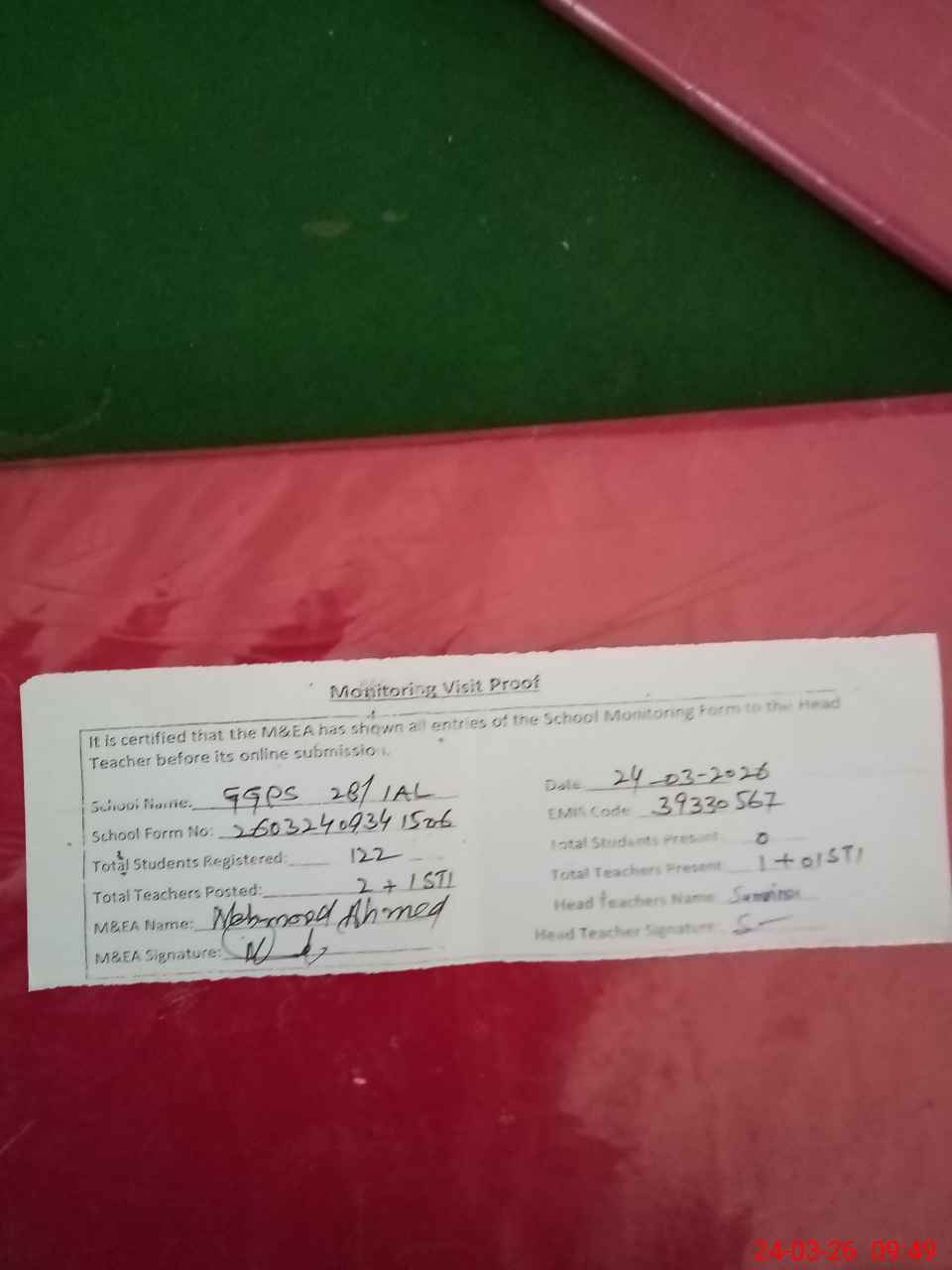 | Attendance Register | Head Teacher | MEA with School | Visit Proof |