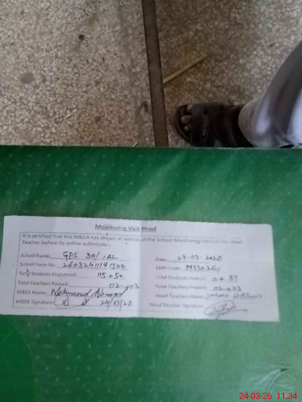 | Attendance Register | Head Teacher | MEA with School | Visit Proof |