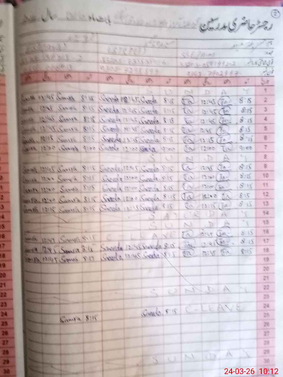 | 33**** | An**** Gh**** | SSE (Arabic) | Contract | 0 | 0 | 15 | 0 | 0 | 0 | 0 | 0 | 0 | Absent (Un-Authorized) |