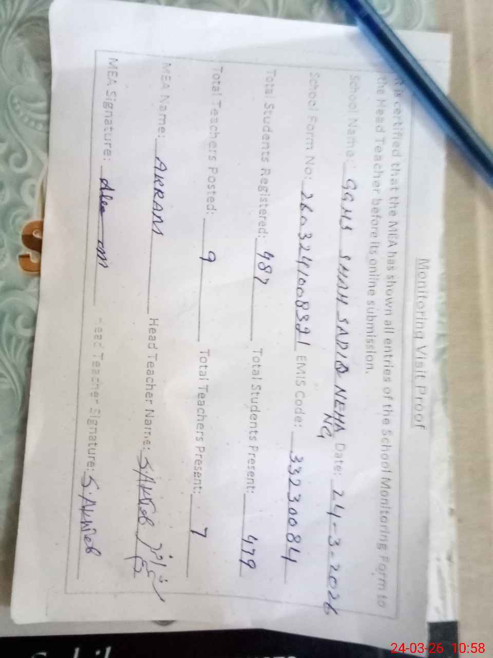| Attendance Register | Head Teacher | MEA with School | Visit Proof |