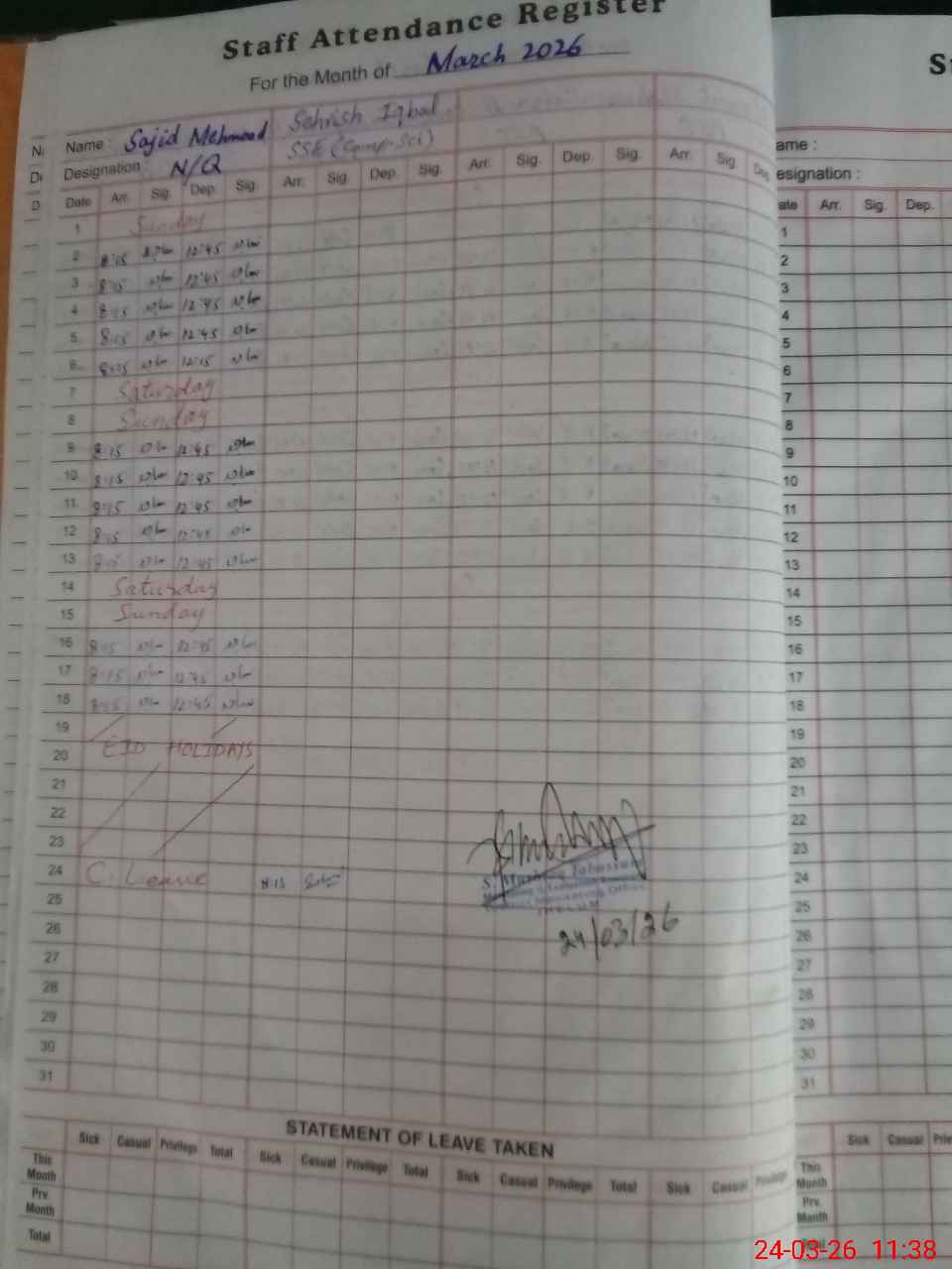 | Total no. of Classrooms: 12 No. of Classrooms Used for Teaching: 10 No. of Classrooms Storing Old Furniture, FTBs, etc: 0Comments if Any: No admin visit for last month. Classes except 6, 7 and 8 are off due to Exam schedule. Muniba Salam SST and Rahila Tanveer EST reported online but still both are in previous schools for handing over record. |