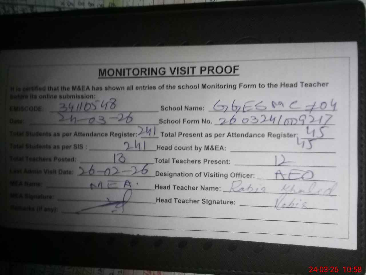 | Attendance Register | Head Teacher | MEA with School | Visit Proof |