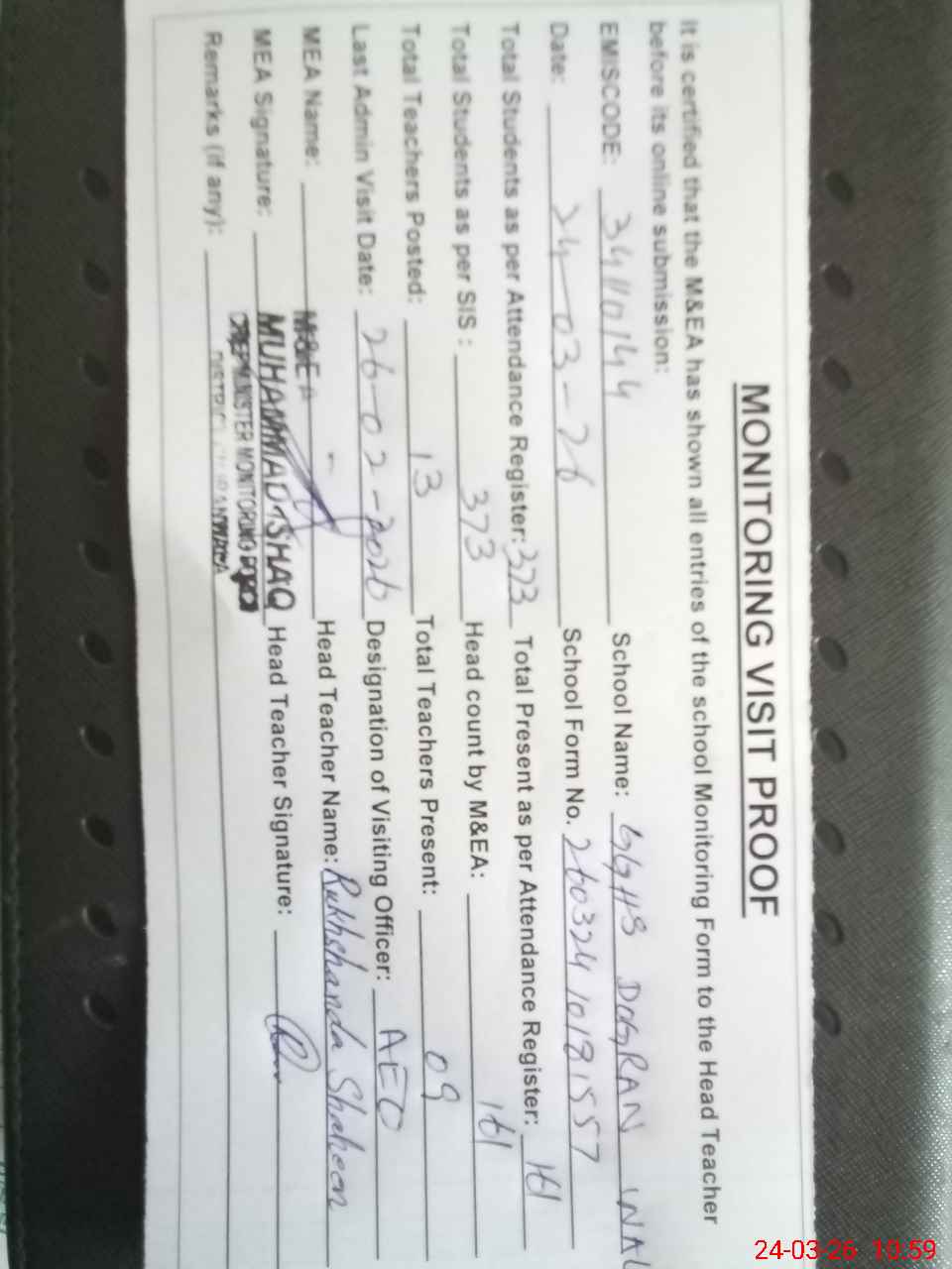 | Attendance Register | Head Teacher | MEA with School | Visit Proof |