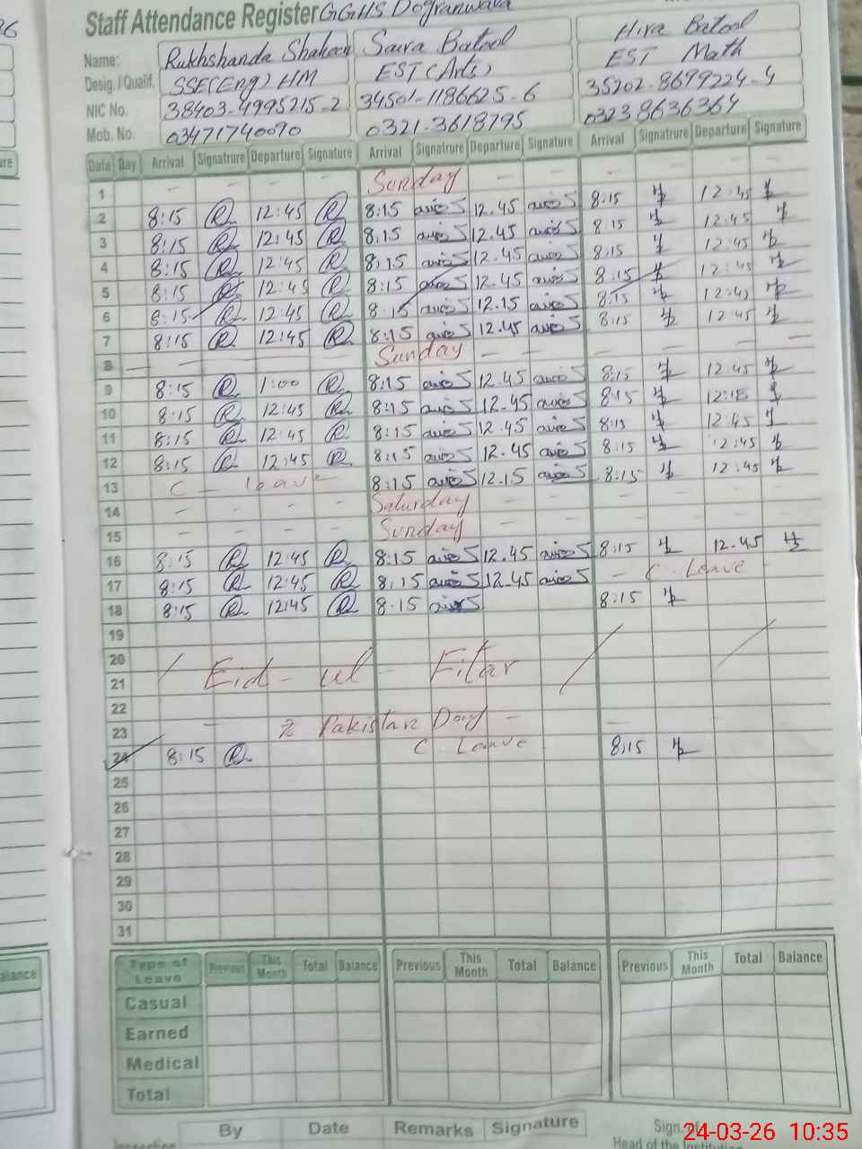 | CNIC | Full Name | Designation | R/C | Absence During Last Calender Month |