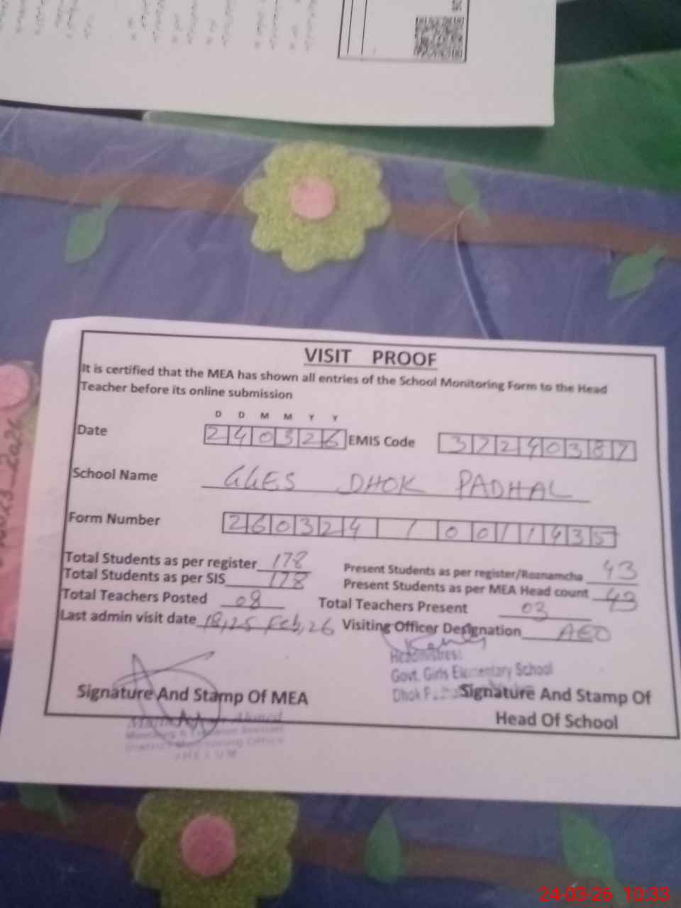| Certified that this School was Inspected by the Undersigned MEA/DMO Today and the Information Stated Above is as Per Record. | |||||