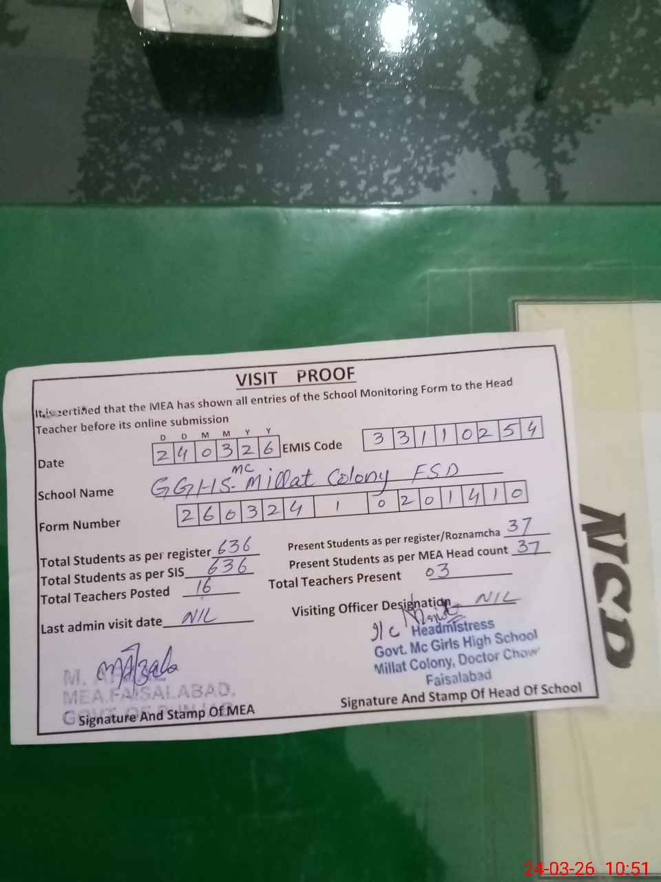 | EMIS Code: 33110254 | Name of School: GGHS MC MILLAT COLONY | |||