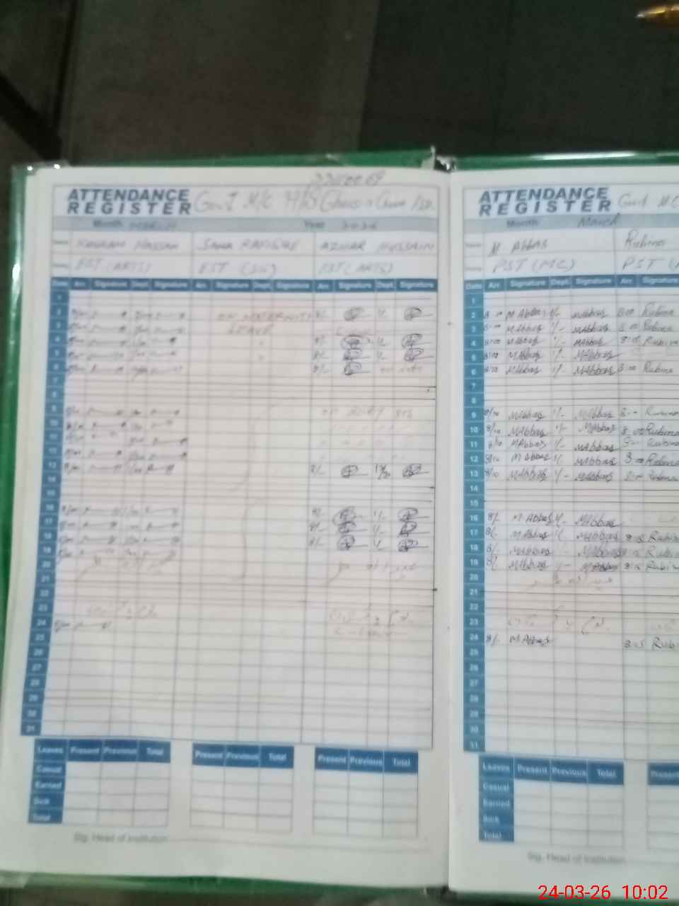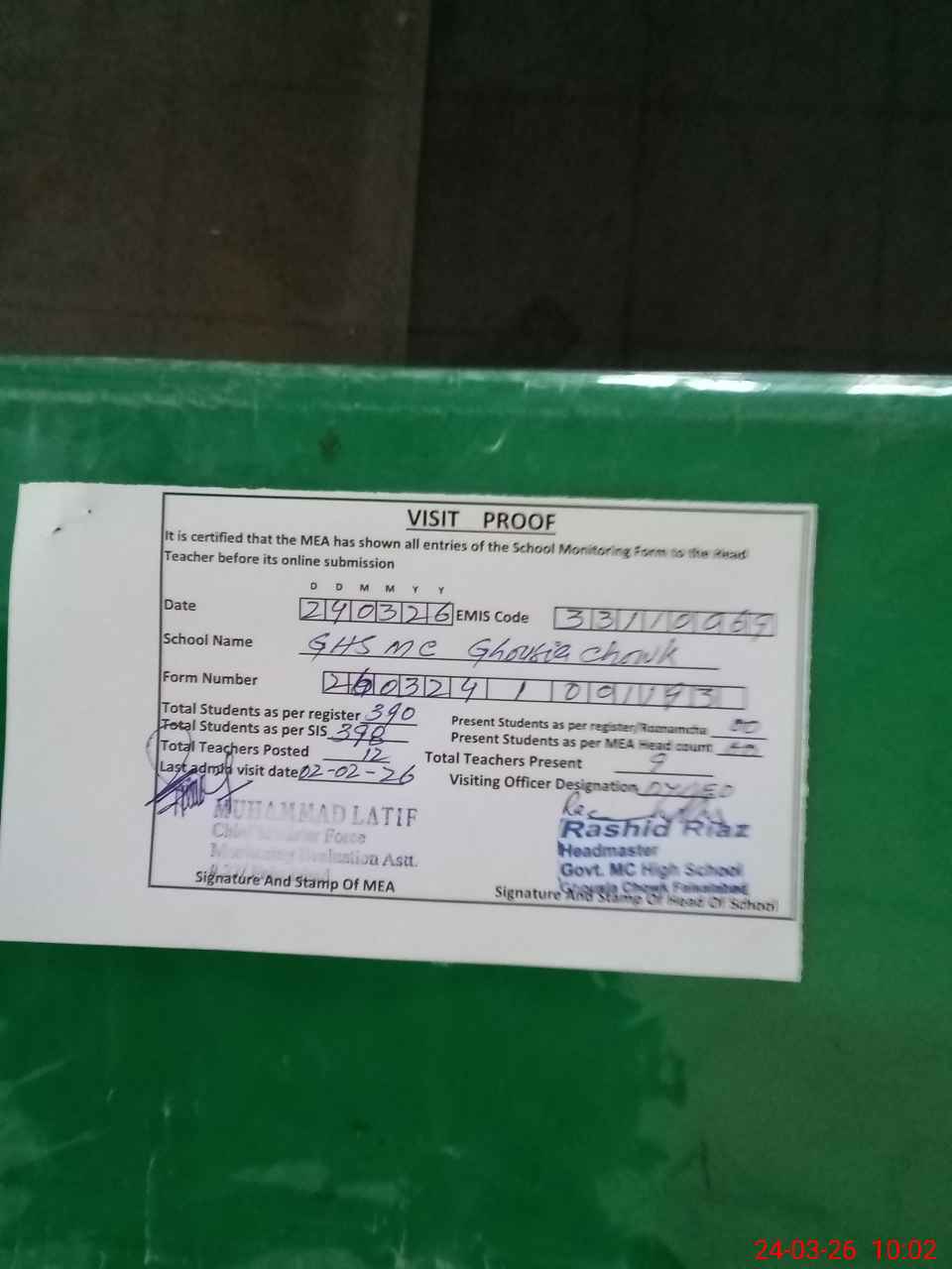 | Remarks (Use Separate Page if Required): Mrs Samrina Sharif PST attendance marked but found absent from school today dt 24 march 26 at 0950AM. Muhammad Junaid JC reached School at 0946 AM. NSB and FTF funds record not provided. It is stated that Exam at dated 24 march 2026 was conducted at 13 march and 17 march 26 due to optional subject datesheet. | |||||
