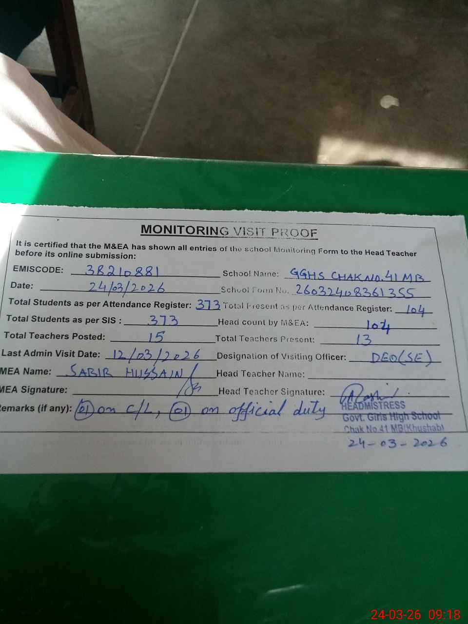 | EMIS Code: 38210881 | Name of School: GGHS CHAK NO 41 MB | |||
