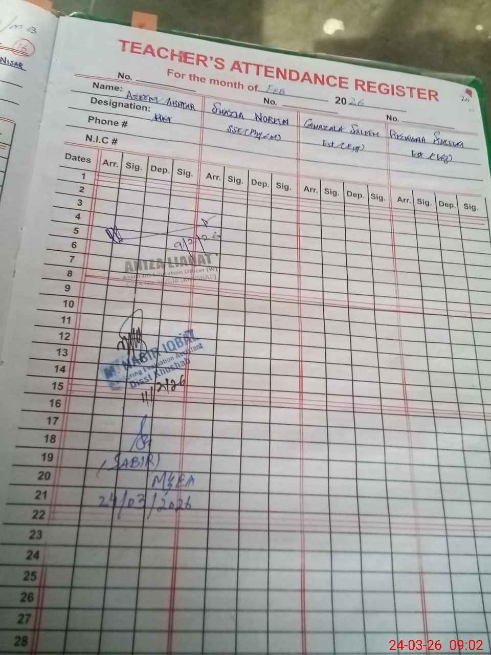 | Remarks (Use Separate Page if Required): no teacher absent total students on register 373 total students on SiS 373 last admin visit by DEO SE on 12 Mar 2036 | |||||