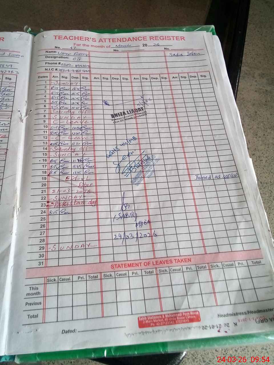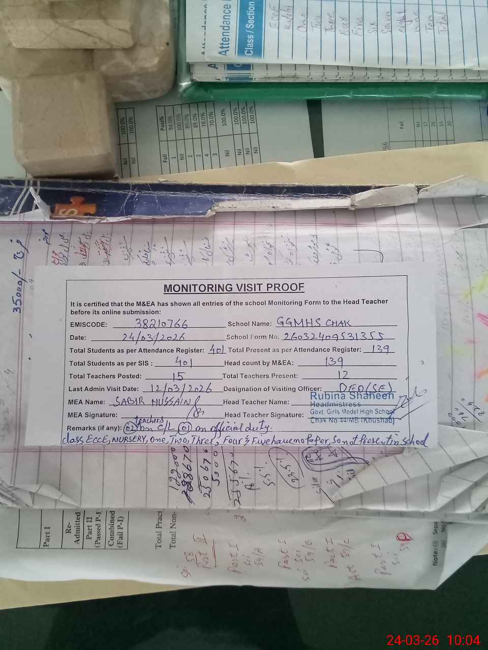 | Remarks (Use Separate Page if Required): no teacher absent total students on register 401 total students on SiS 401 last admin visit by DEO SE on 12 Mar 2026 class ECCE Nursery,one, two, three, four,and five have no paper so not present in school. | |||||