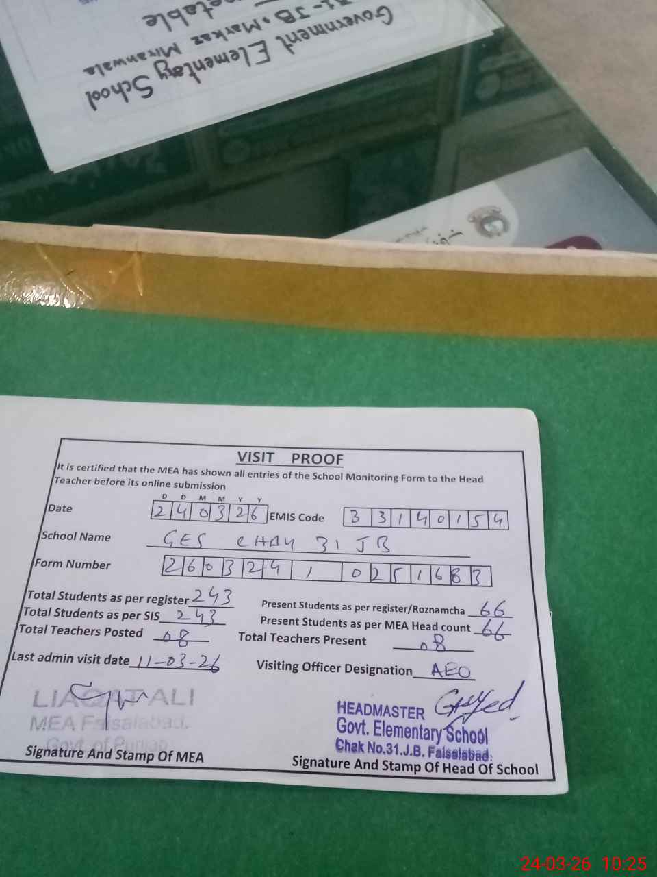 | Certified that this School was Inspected by the Undersigned MEA/DMO Today and the Information Stated Above is as Per Record. | |||||