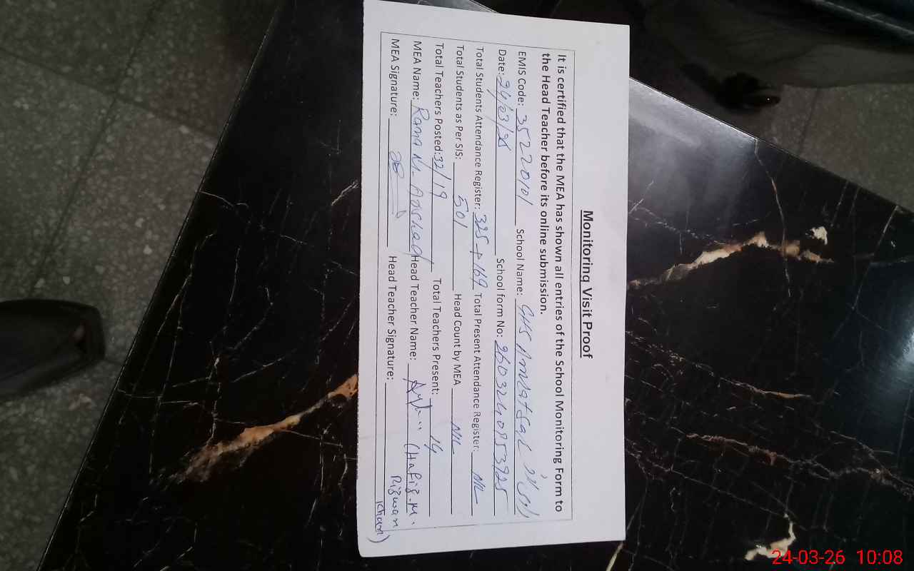 | Remarks (Use Separate Page if Required): Head teacher Raza Siddique SST and teacher Waqas Aslam SST and teacher Qamar Amanat on casual leave but Casual leave record not available in school or not showing to MEA so according to monitoring sop mark them Absent today. Teacher Syda Asma Batool and teacher Uzma Naheed attendance blank on attendance register and not physically present in school so according to monitoring sop mark them Absent today. JC Shabbir Hussain present as per attendance register but he was not physically present in school so according to monitoring sop mark him Absent today. NSB record not maintain on SIS after January 2025. | |||||