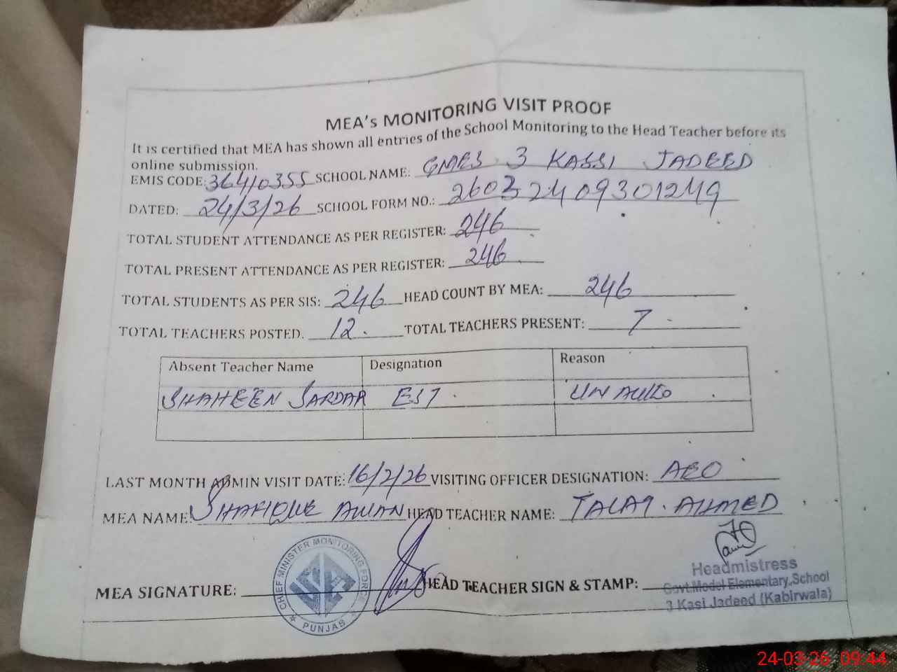 | Attendance Register | Head Teacher | MEA with School | Visit Proof |