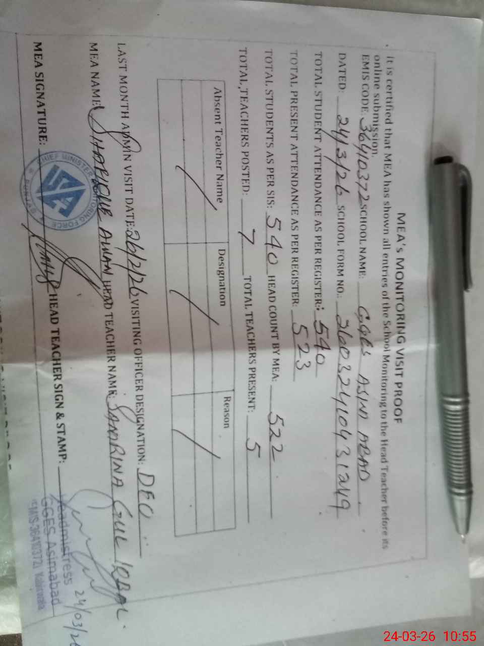| Attendance Register | Head Teacher | MEA with School | Visit Proof |