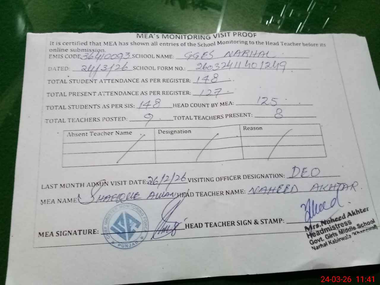 | EMIS Code: 36410093 | Name of School: GGES NARHAL, KABIRWALA | |||
