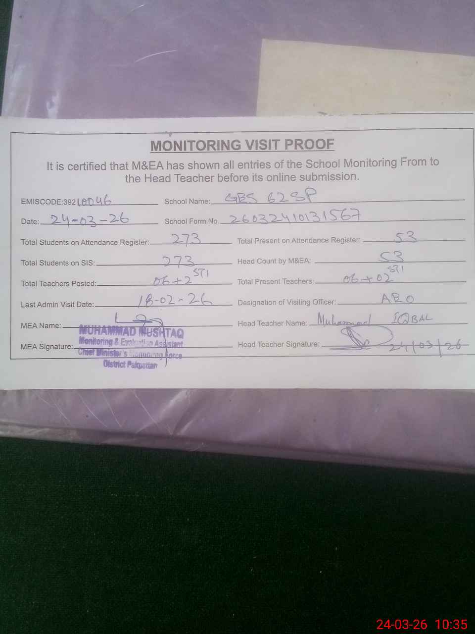 | Certified that this School was Inspected by the Undersigned MEA/DMO Today and the Information Stated Above is as Per Record. | |||||