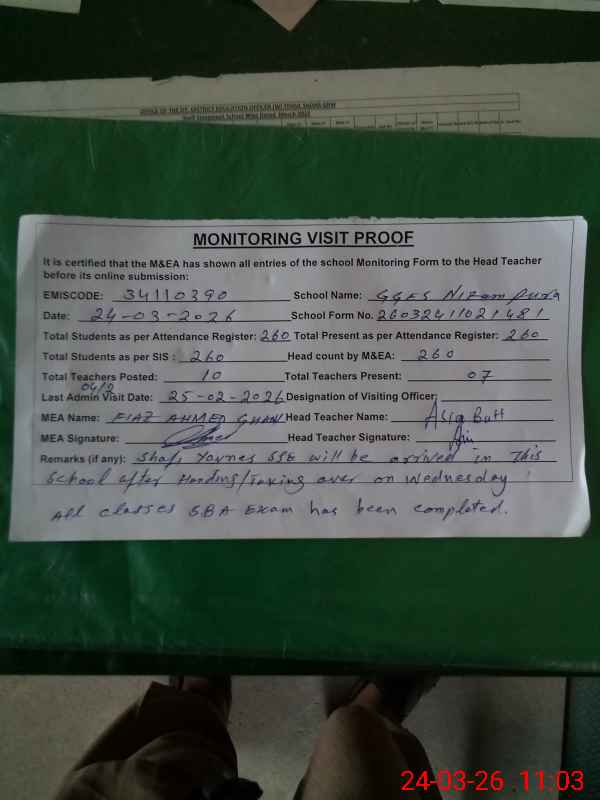 | Remarks (Use Separate Page if Required): Attendance of teaching staff and students on SIS Software is not updated All Classes SBA Exam has been completed Shafi Younas SSE Presently completing her handing/ taking over in her previous School and will be arrive Wednesday in this School NSB Record Register is not available at the time of visit Data as per provided by School Staff and found during physical visit | |||||