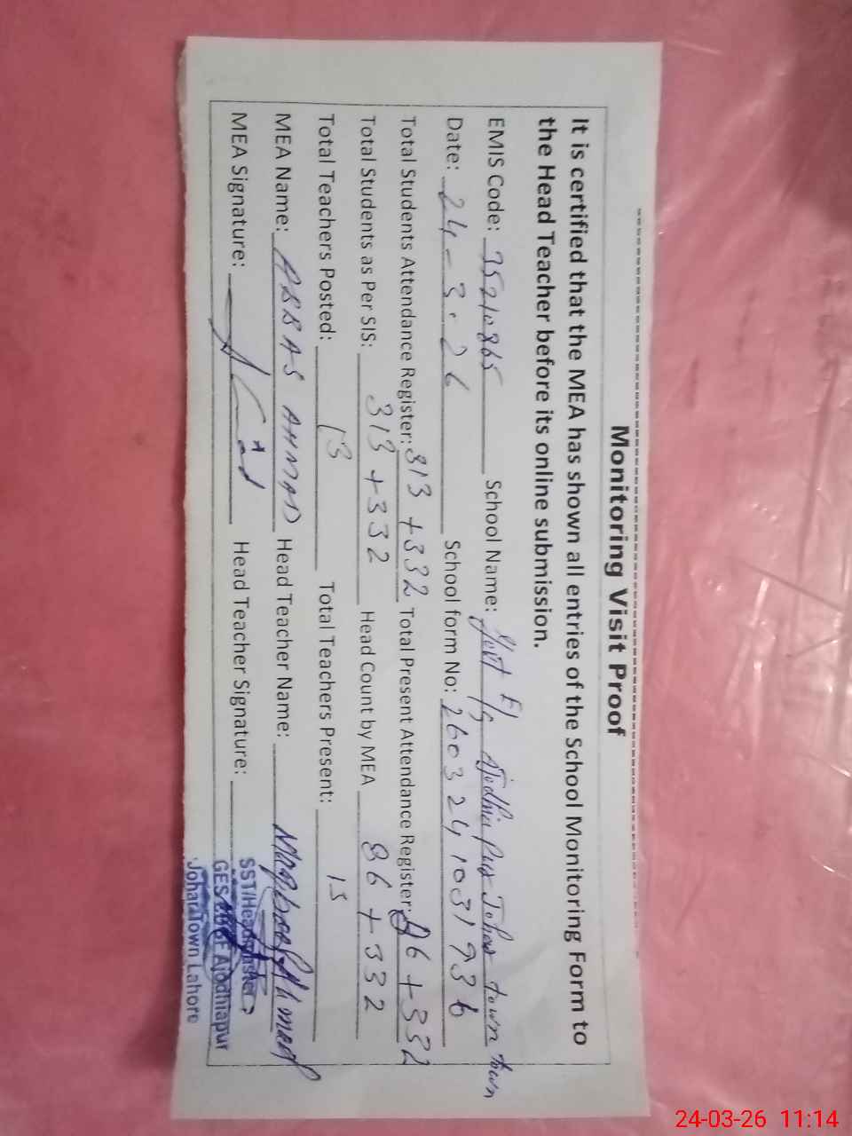 | EMIS Code: 35210865 | Name of School: GES AJODHIA PUR JOHAR TOWN (EX-MCL) | |||