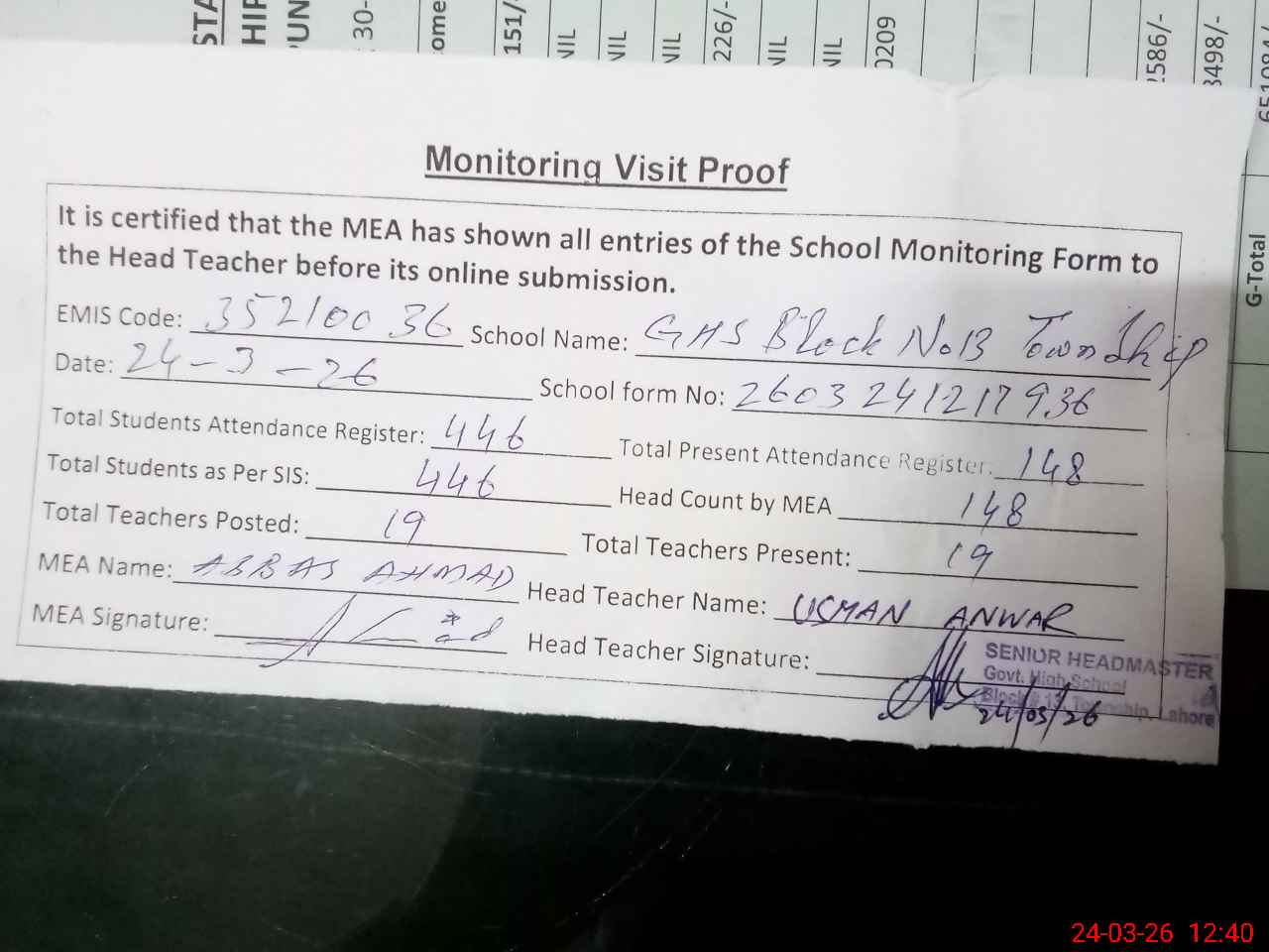 | Attendance Register | Head Teacher | MEA with School | Visit Proof |