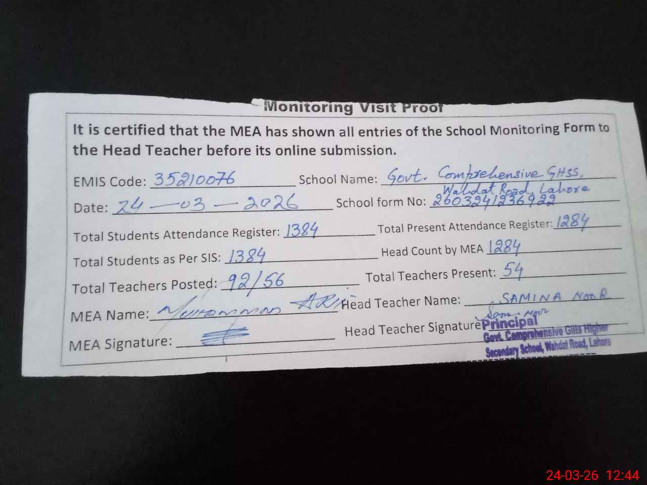 | Attendance Register | Head Teacher | MEA with School | Visit Proof |
