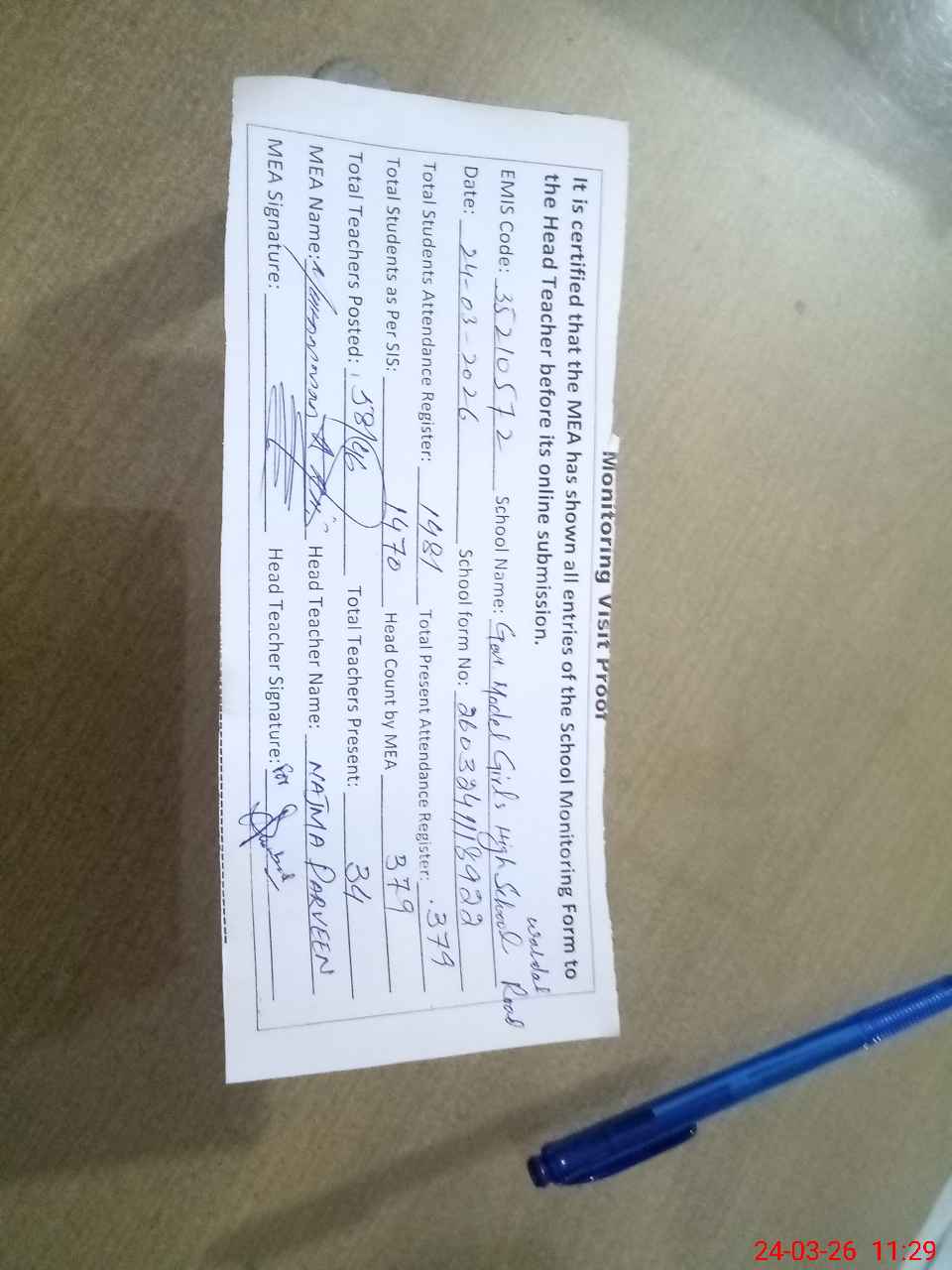 | Attendance Register | Head Teacher | MEA with School | Visit Proof |
