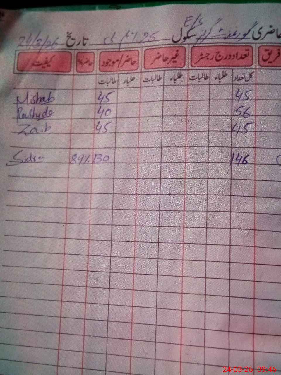 | Remarks (Use Separate Page if Required): gges 25 mb student on sis 378 student on register 304 head count 139 no teacher absent no visit as no aeo assigned class room required security guard required swing slides required only 6 7 8 class present due to papers all other classes are suspended due to war situation. 74 student are of after noon classes | |||||