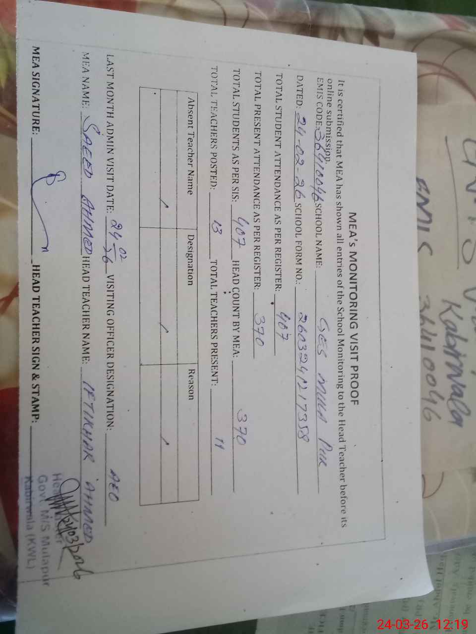 | EMIS Code: 36410046 | Name of School: GES MOULA PUR KABIRWALA | |||